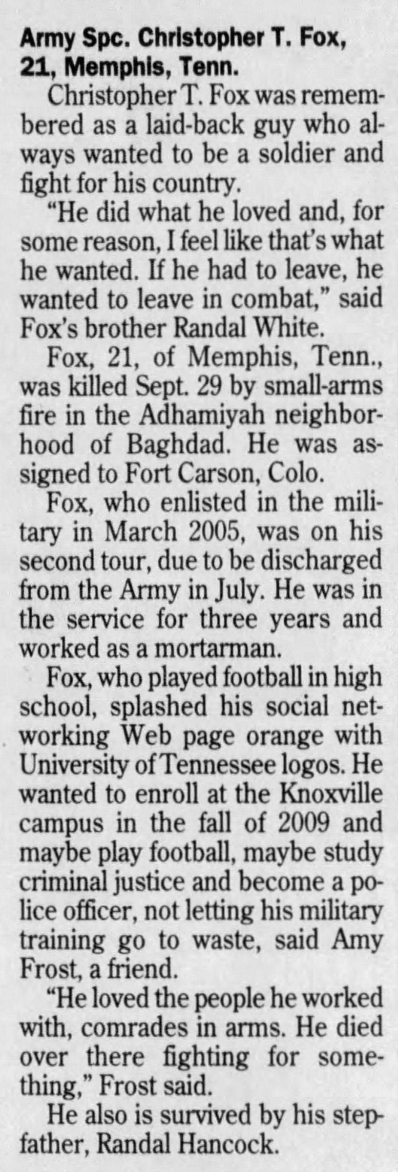 Specialist Christopher T. Fox was born on October 7, 1986 in Memphis. He attended Hamilton High School and then the Dr. Benjamin L. Hooks Job Corps Training Facility in Arkansas where he received carpentry training and his GED. Fox joined the Army in March 2005 and was sent to Fort Benning, Georgia for basic training. After training he was assigned to Fort Carson, Colorado to B Company, 1st Battalion, 68th Armor Regiment in the 3rd Heavy Brigade Combat Team, 4th Infantry Division.