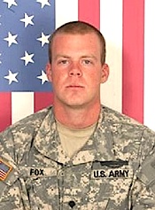 Fox served his first tour in Baqubah, Iraq from November 2005 until January 2007. During this time he received a Purple Heart for wounds received from the explosion of an Improvised Explosive Device (IED). He returned to Iraq for a second tour in 2008. Fox was Killed In Action on September 29, 2008, age twenty-one, in Adhamiyah, Iraq when he encountered small-arms fire while conducting a dismounted routine patrol. Fox had been approached by local children requesting water from the soldiers. After receiving permission to retrieve the bottles from the vehicle, he was shot in the right armpit by a sniper. This was one week before his twenty-second birthday.
