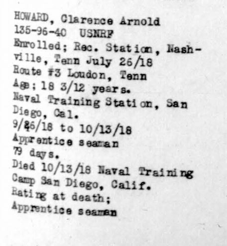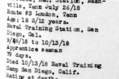 He died at the Naval Training Camp San Diego at Los Angeles, CA, of Influenza 13 October 1918.