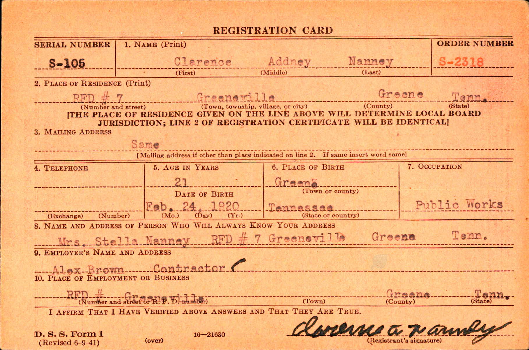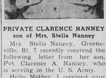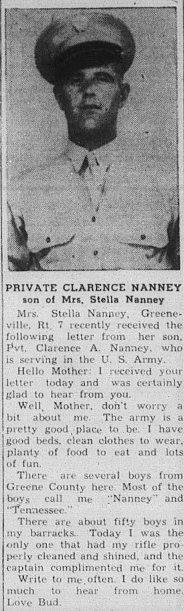 Mrs. Stella Nanney, Greeneville, Rt. 7 recently received the following letter from her son, Pvt. Clarence A. Nanney, who is serving in the U.S. Army. Hello Mother: I received your letter today and was certainly glad to hear from you. Well, Mother, don’t worry a bit about me. The army is a pretty good place to be. I have good beds, clean clothes to wear, planty of food to eat and lots of fun. There are several boys from Greene County here. Most of the boys call me “Nanney” and “Tennessee.” There are about fifty boys in my barracks. Today I was the only one that had my rifle properly cleaned and shined, and the captain complimented me for it. Write to me often. I do like so much to hear from home. Love Bud.