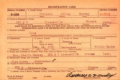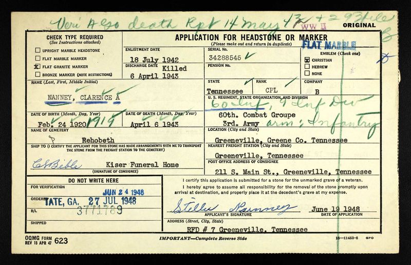 Clarence Addney “Bud” Nanney was born in Greene County, Tennessee, the son of Stella Ricker Nanney. He was a carpenter before he enlisted in the Army on July 4, 1942 at Fort Oglethorpe, Georgia. He served in Co B, 60th Inf, US Army, WWII. He was killed in North Africa April 6, 1943 and buried in Rehoboth Cemetery, Greene County, TN.