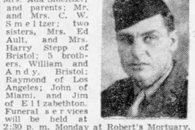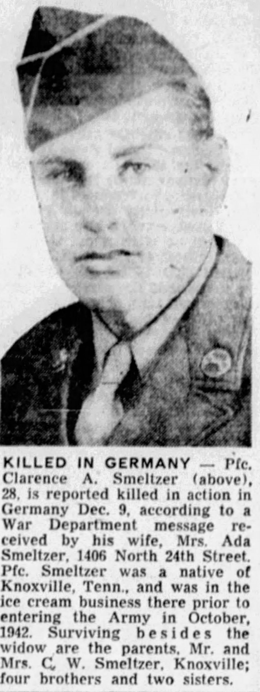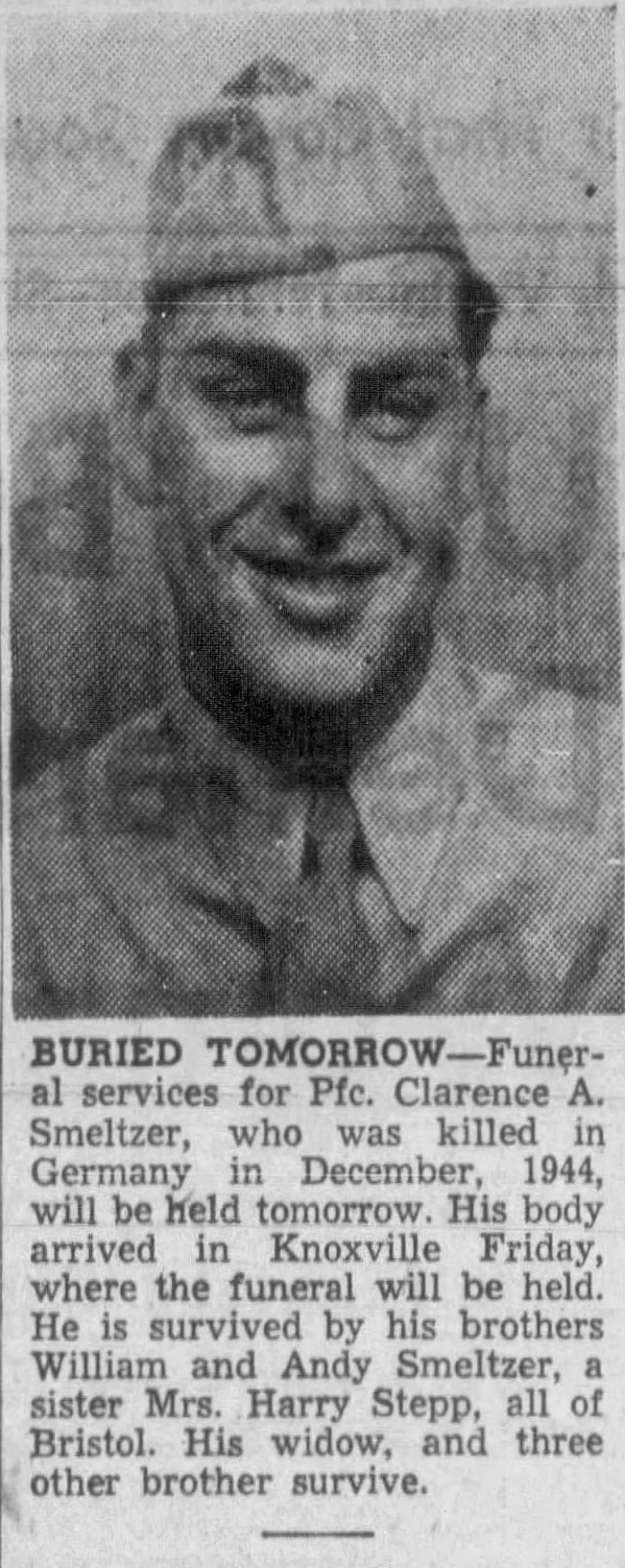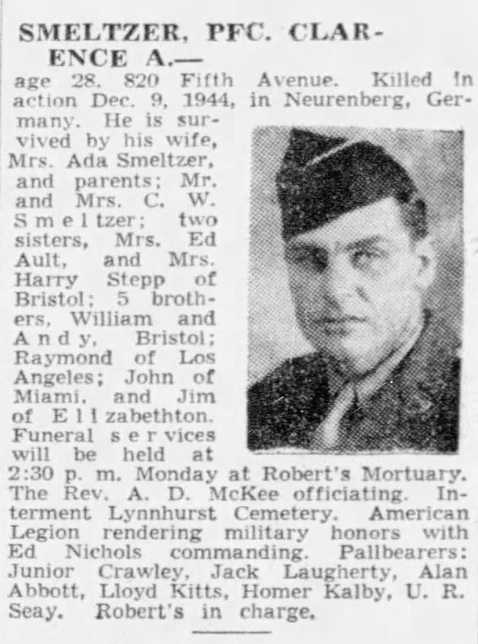 Pfc. Clarence A. Smeltzer, age 28, 820 Fifth Avenue, Killed in action Dec. 9, 1944, in Neurenberg, Germany. He is survived by his wife, Mrs. Ada Smeltzer, and parents; Mr. and Mrs.C.W Smeltzer; two sisters, Mrs. Ed Ault, and Mrs. Harry Stepp of Bristol; 5 brothers, William and Andy, Bristol; Raymond of Los Angeles; John of Miami, and Jim of Elizabethton.