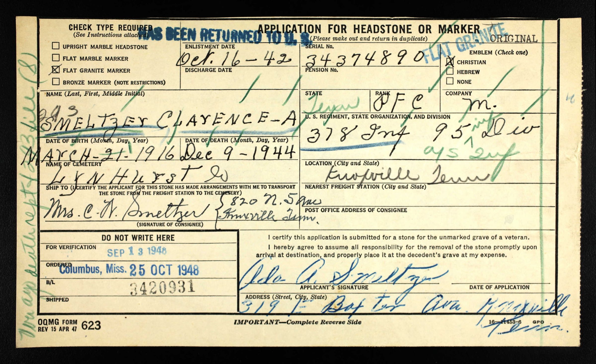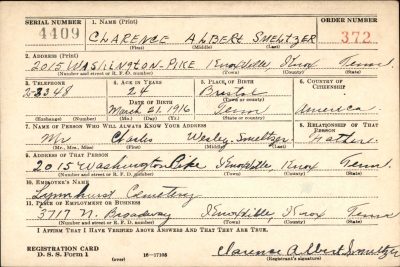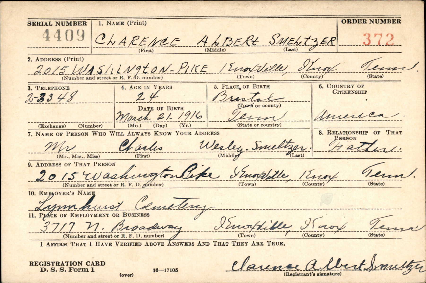 Clarence Albert Smeltzer was born in Bristol, Tennessee on 21 March 1916, the son of Charles Wesley Smeltzer and Lillie Mae Trobough. He was the husband of Ada Aleda Crawly. He enlisted on October 2, 1942, in Fort Oglethorpe, GA