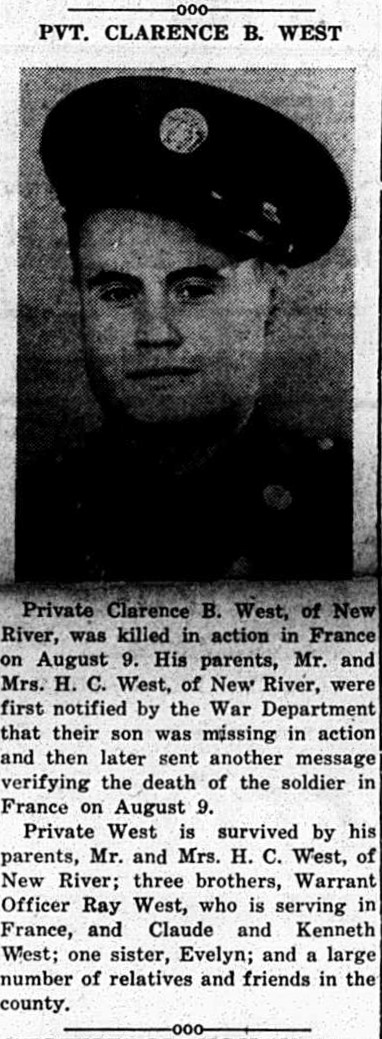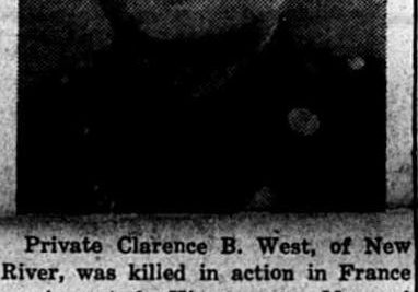 Private Clarence B. West, of New River, was killed in action in France on August 9. His parents, Mr. and Mrs. H.C. West, of New River, were first notified by the War Department that their son was missing in action and then later, sent another message verifying the death of the soldier in France on August 9.