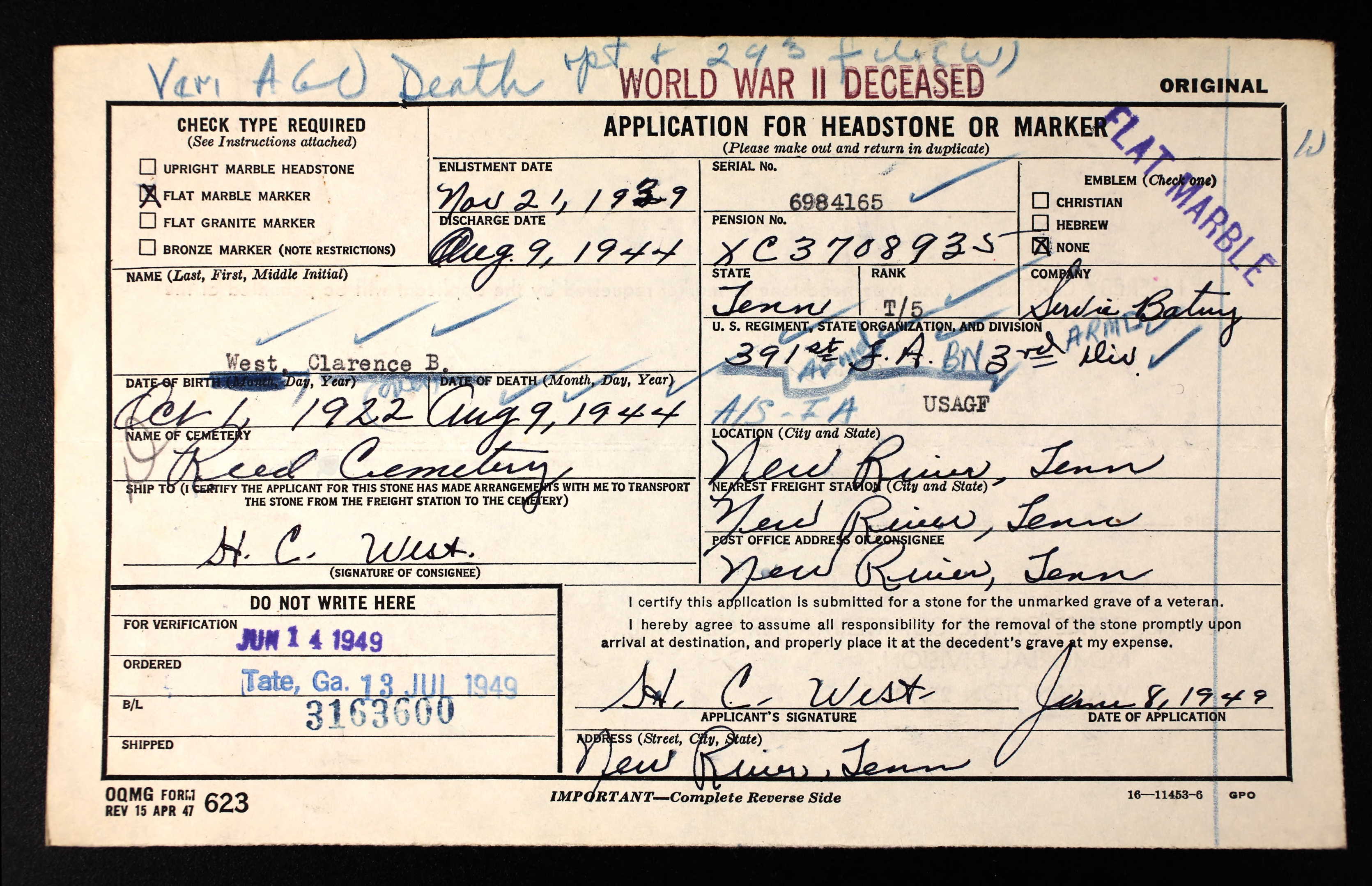 Clarence West was the son of Henry Claborn West and Clara D. Phillips. His brother Ray West was also killed in action during World War II.