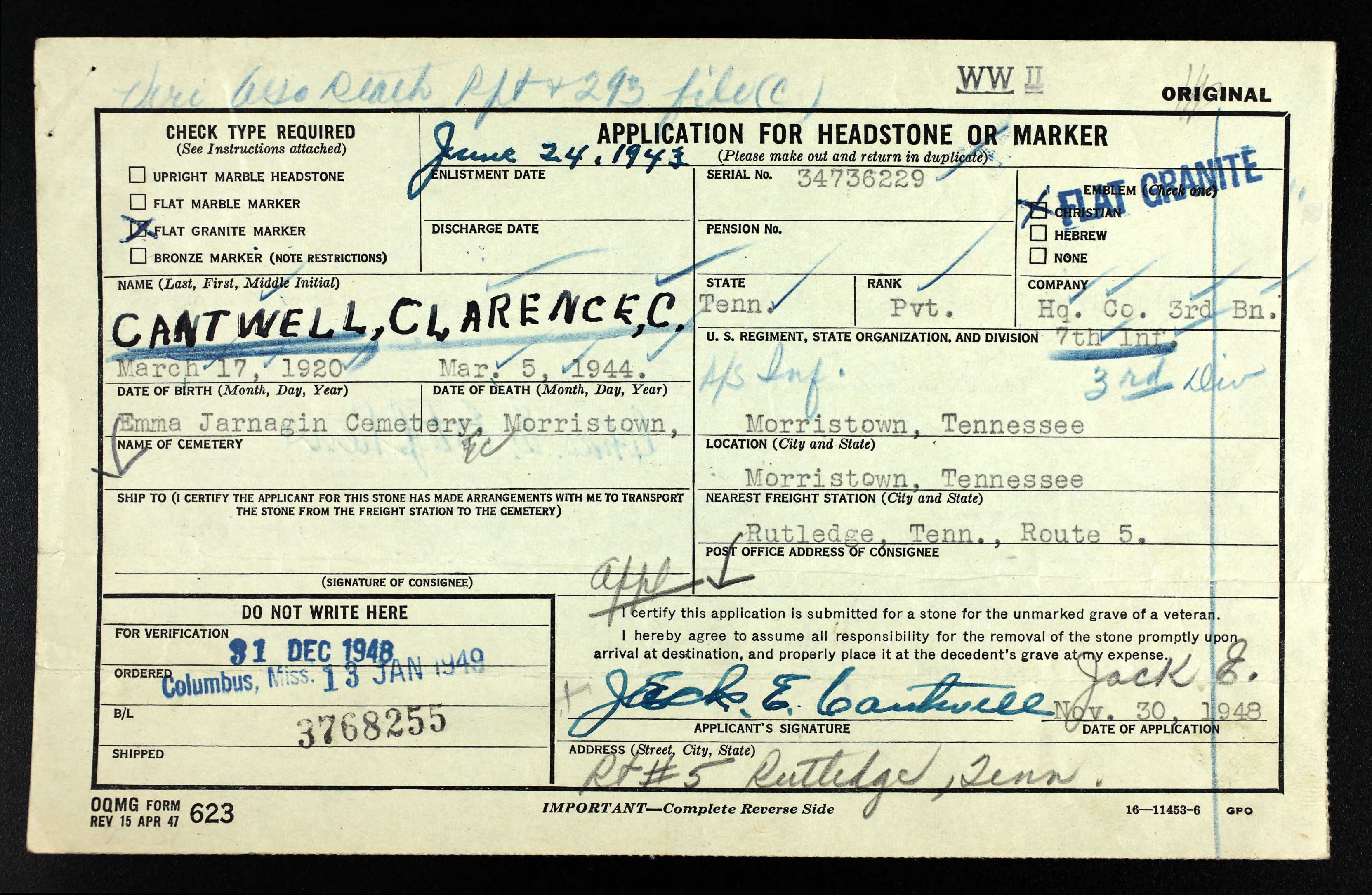 Pvt. Clarence Carson, 24, was killed in action in Italy March 5. A member of New Prospect Baptist Church in Grainger County, he was the son of Mr. and Mrs. J.E. Cantwell, Rutledge. Other survivors: wife and daughter, Mrs. Martha Dean Canwell and Carol Jean, of Baltimore, Md.; two brothers, Jack Cantwell; with U.S. Navy in England, and Billy Cantwell, Rutledge; three sisters, Mrs. R.B. Chambers of Maryland, Mrs. Eugene Kidwell of Rutledge and Mrs. Ernest Roberts, of Riverside, Cal., and a host of relatives and friends.