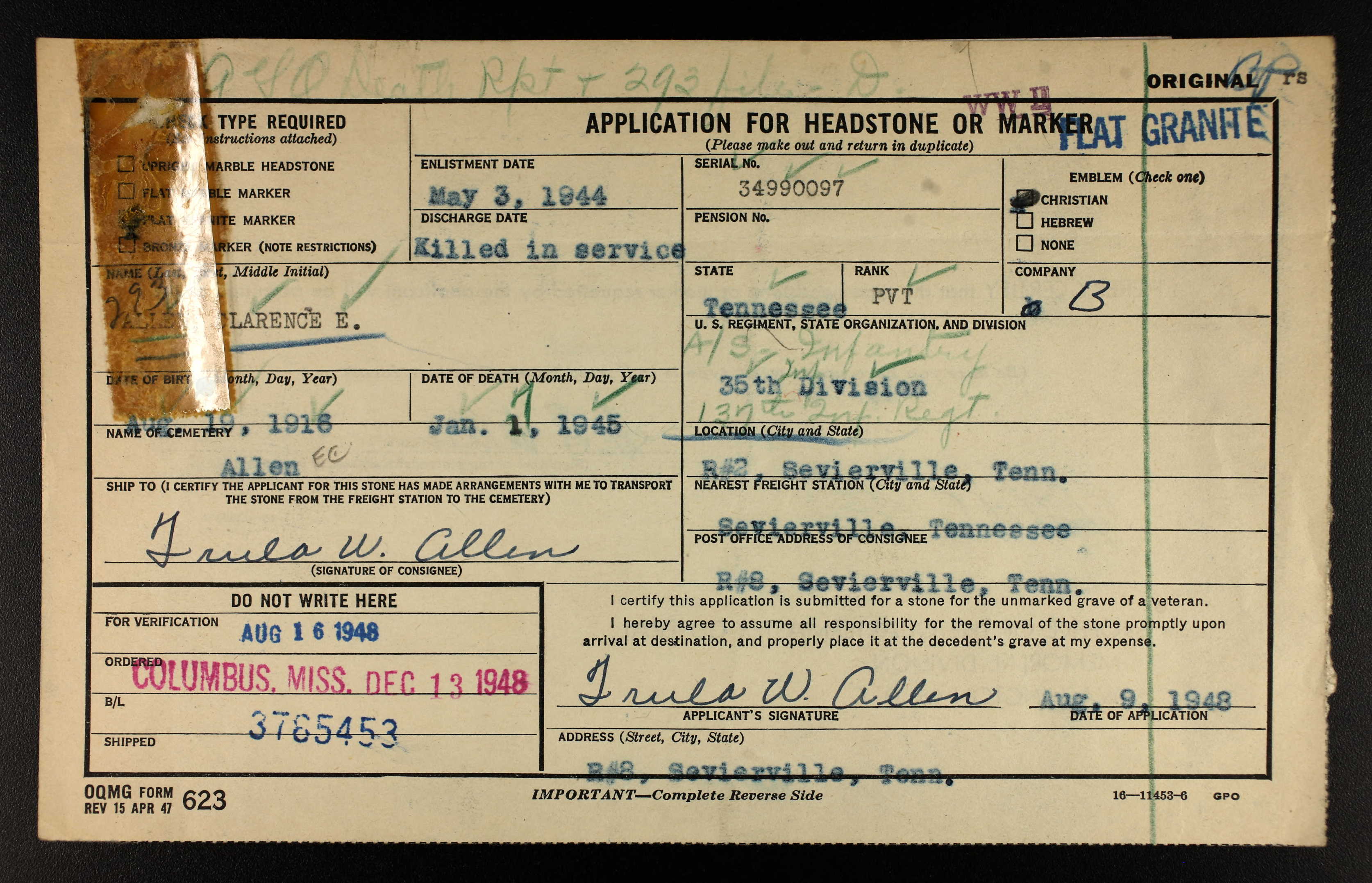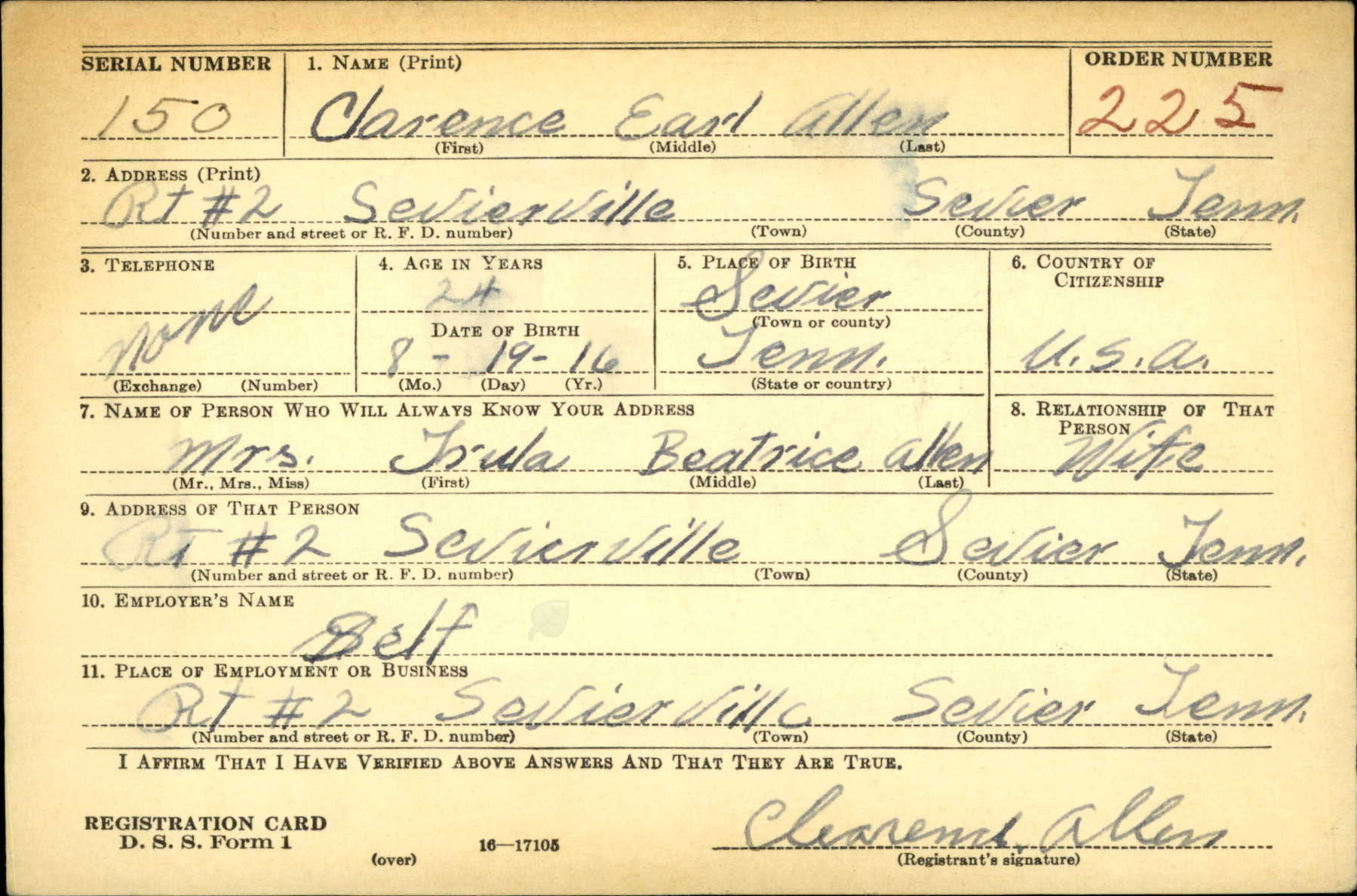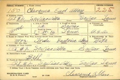 Clarence E. Allen as born 19 August 1916, son of Absalom Monroe ”Roe” Allen and Cora Elizabeth Williams. He was survived by his wife, Trula Williams; son, Clarence Daniel; 3 daughters, Geraldine, Deanna, Alice LaVone; parents; sister, Mrs. Dayton Finchum, Mrs. Onas Finchum; Brother, Dallas of Va, Bates of Sevier County