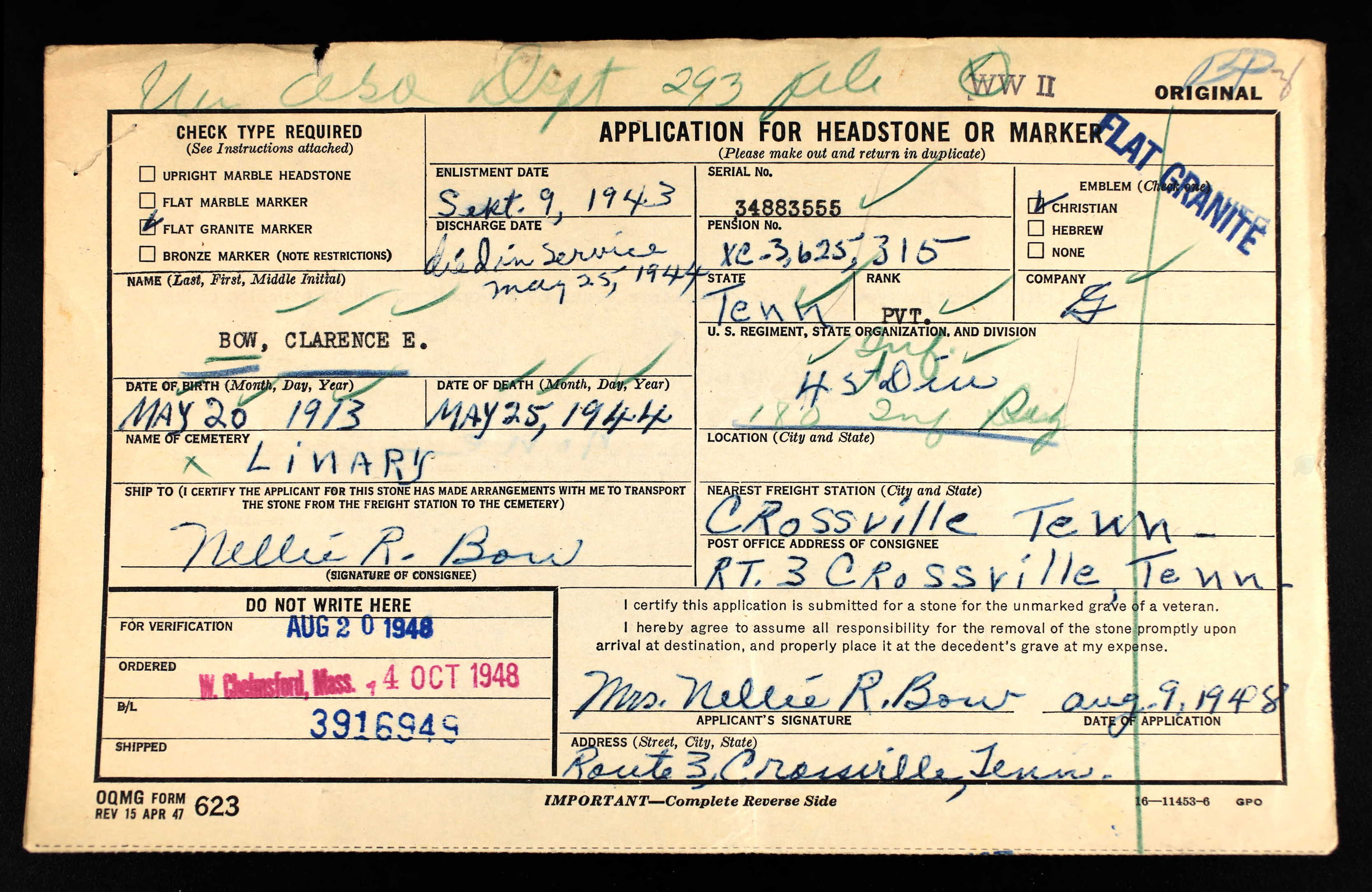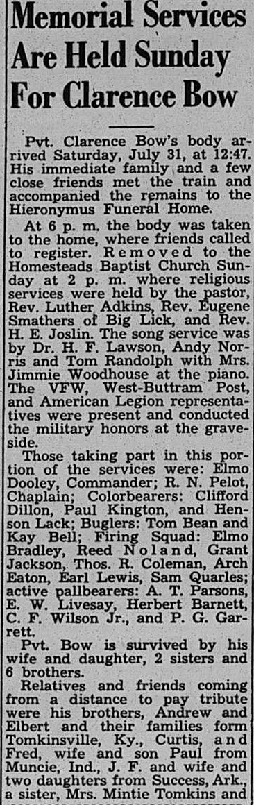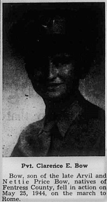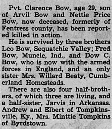 Pvt. Clarence Bow, age 29, son of Arvil Bow and Nettie Price Bow, now deceased, formerly of Fentress county, has been reported killed in action.