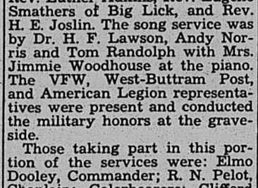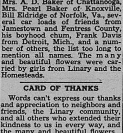 He is survived by three brothers, Leo Bow, Sequatcie Valley; Fred Bow, Muncie, Ind., and Dow C. Bow, who is now with the armed forced in England, and an only sister, Mrs. Willard Beaty, Cumberland Homesteads.