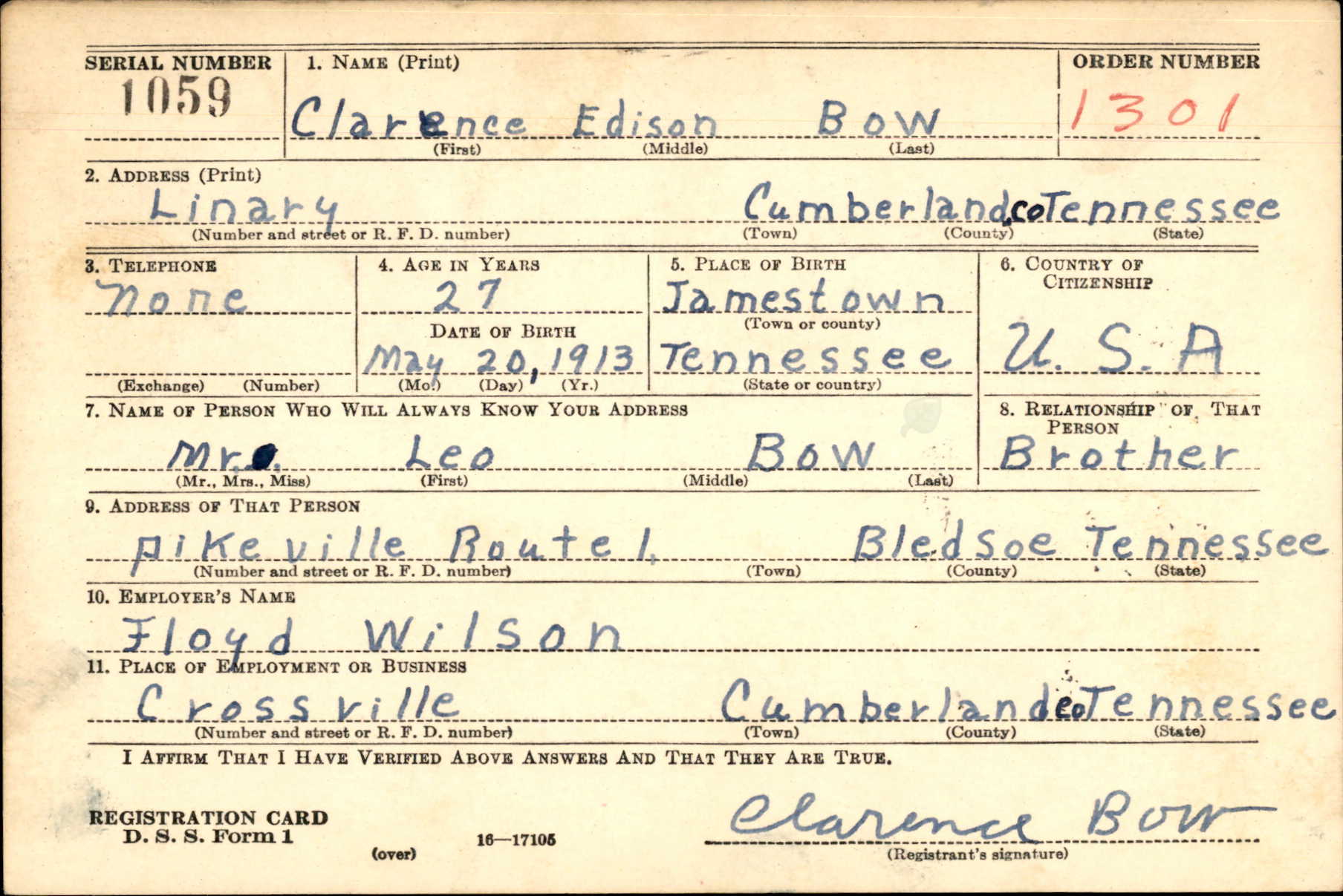 Clarence Edison Bow was born on 20 May 1913 in Fentress County, Tennessee, the son of Arvil Demont and Bernetta Ellen Price Bow. Husband of Nell Ruth Baker.
