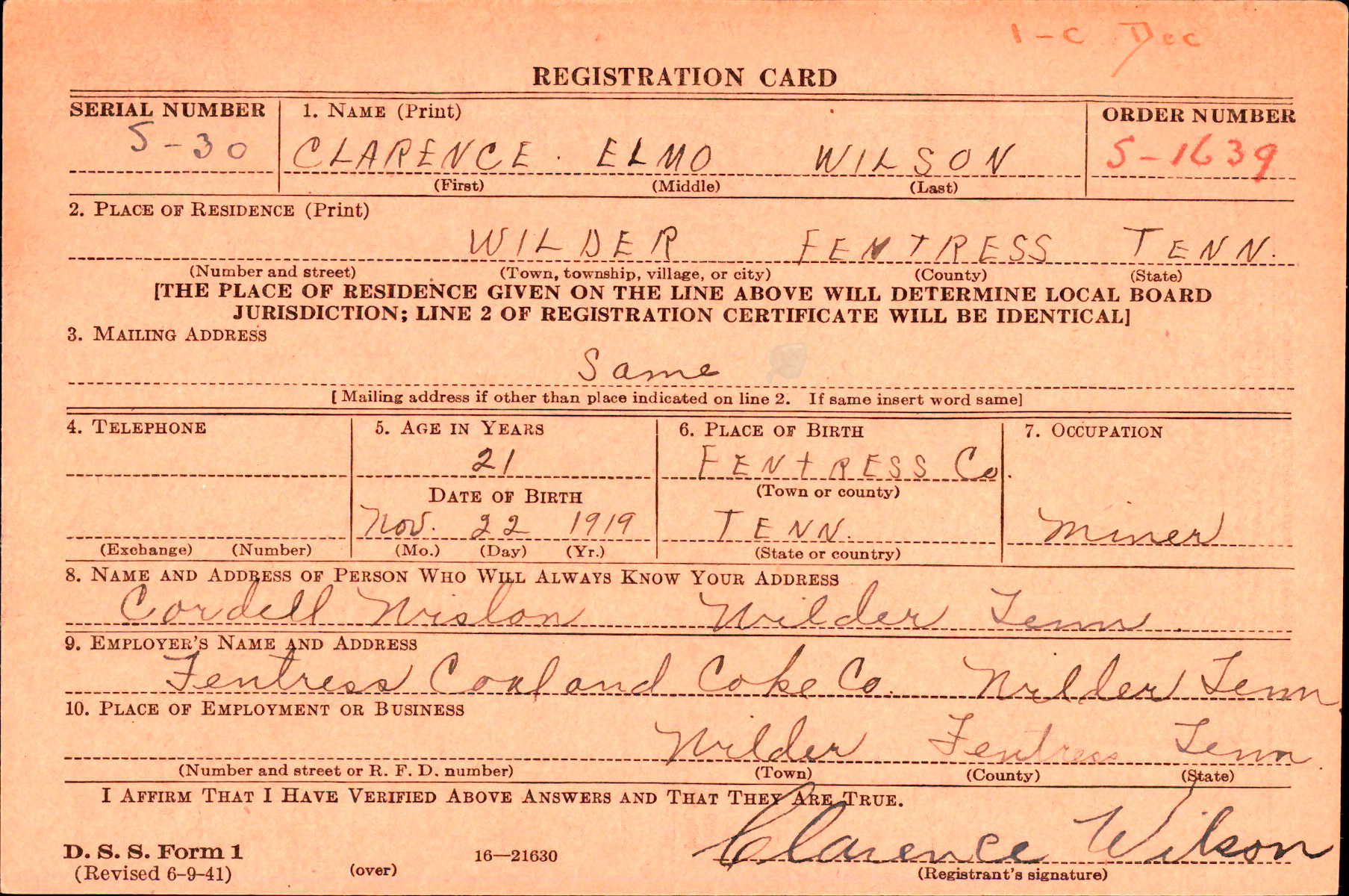 Clarence Elomo Wilson was born on 22 November 1919. He was married to Eva Aline McNally and father of Ellen Kay Wilson. He was the son of Cordell A. and Millie Wilson.
