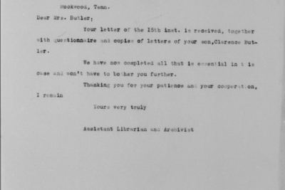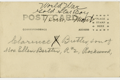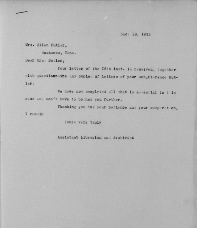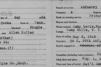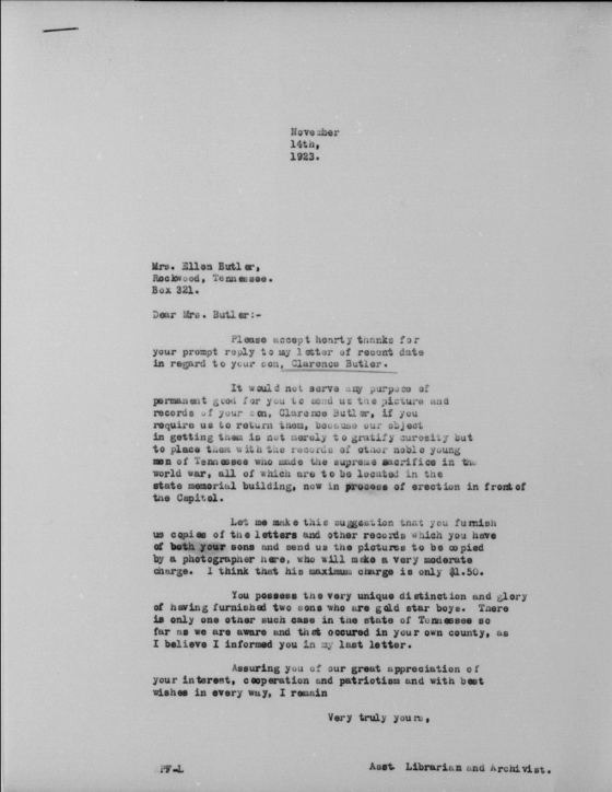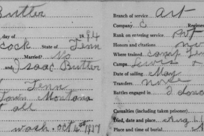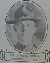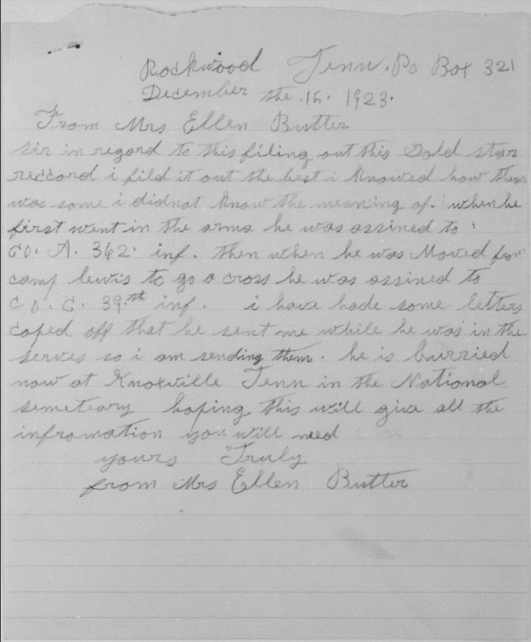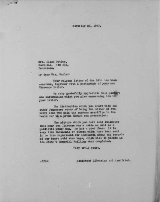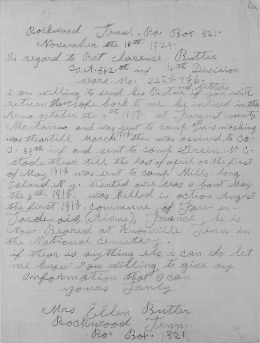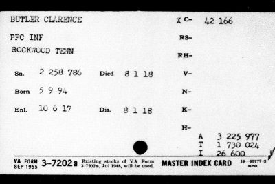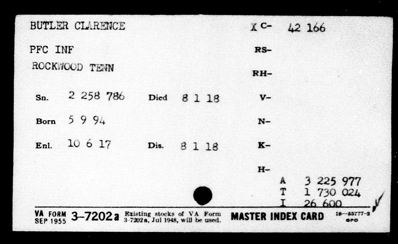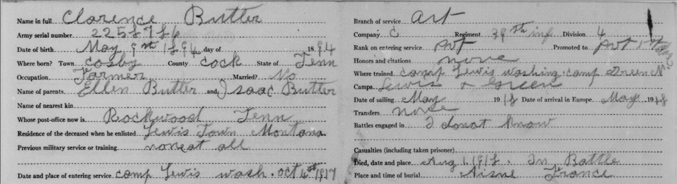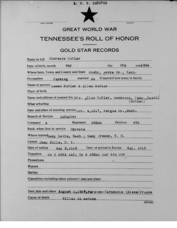 Sergeant Clarence F. Butler was born in Cosby, Cocke County, Tennessee to Isaac and Ellen Butler. He was Killed in Action in Fère-en-Tardenois, France on 1 August 1918 and was interred at C,7,15, Somme American Cemetery, Bony, France. He was later buried at Knoxville National Cemetery.