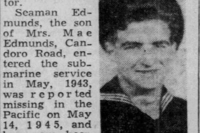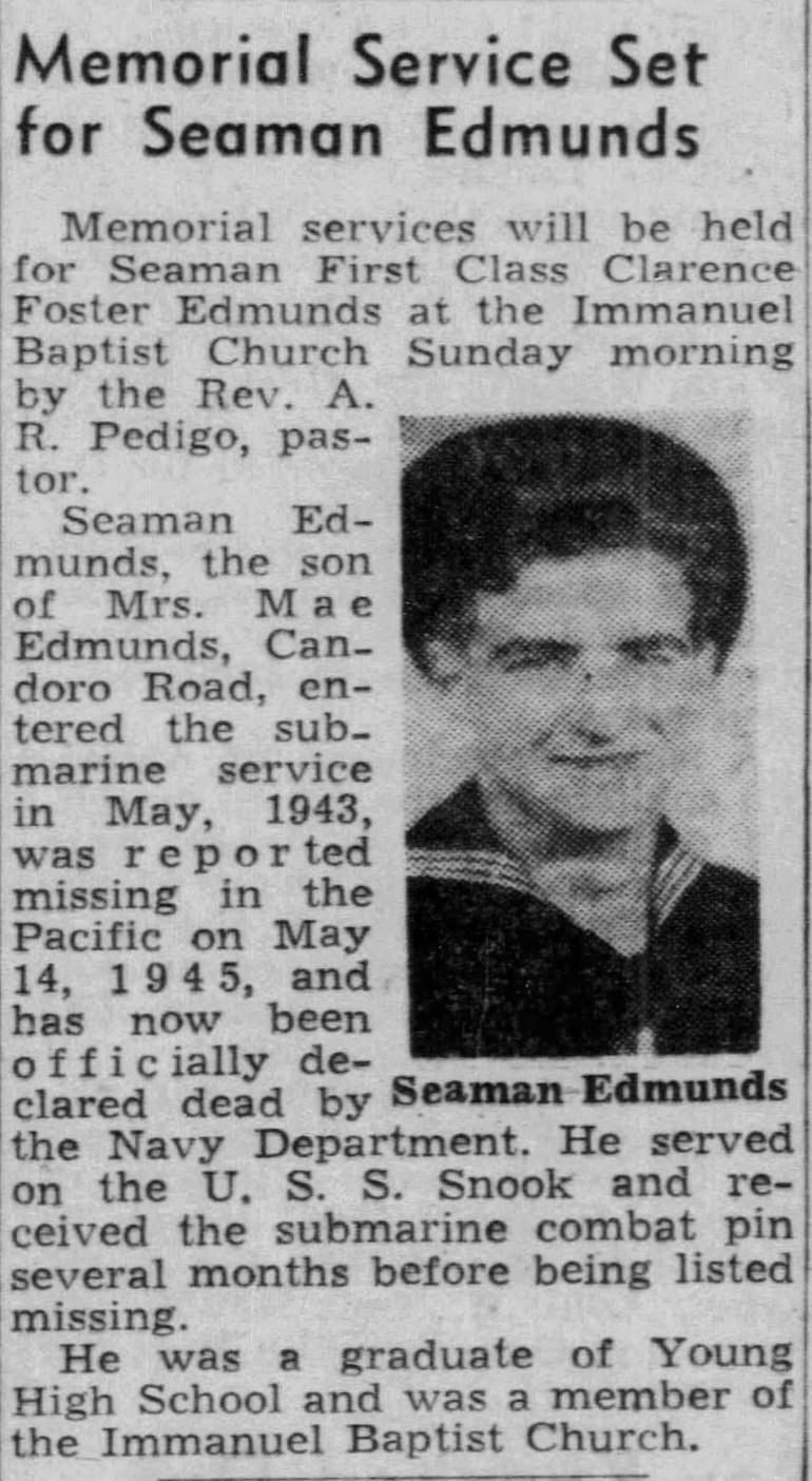 Memorial services will be held for Seaman First Class Clarence Foster Edmunds at the Immanuel Baptist Church. Seaman Edmunds, the son of Mrs. Mae Edmunds, Candoro Road, entered the submarine service in May, 1943, was reported missing in the Pacific on May 14, 1945, and has now been officially declared dead by the Navy Department. He served on the U.S.S. Snook and received the submarine combat pin several months before being listed missing. He was a graduate of Young High School and was a member of the Immanuel Baptist Church.