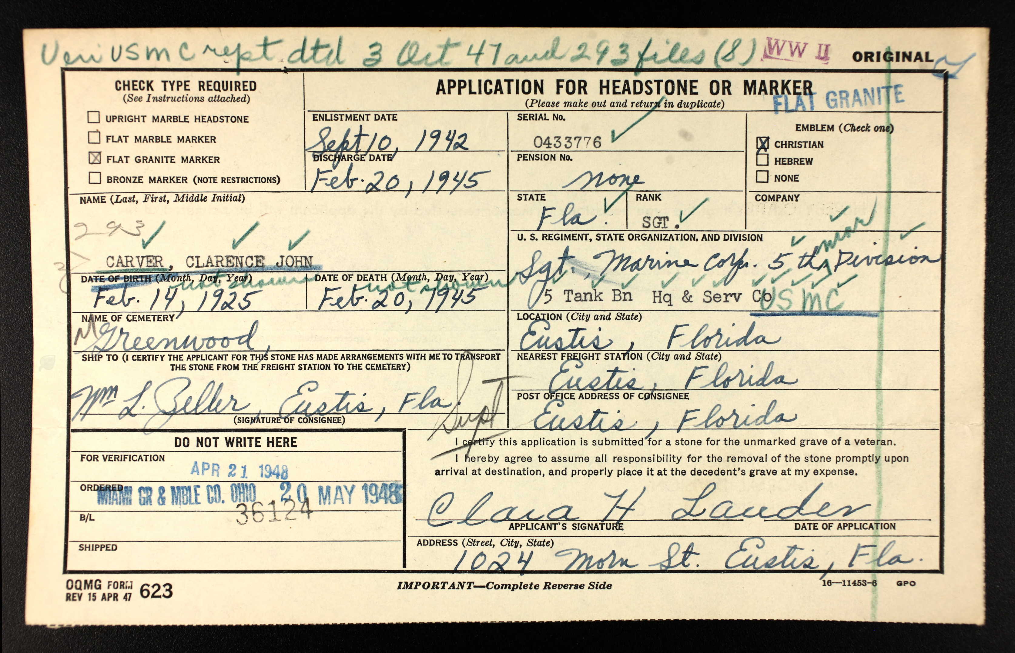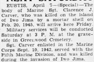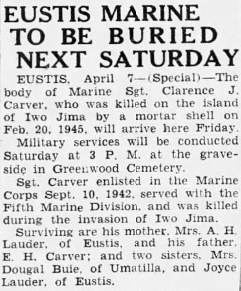 The body of Marine Sgt. Clarence J. Carver, who was killed on the island of Iwo Jima by a mortar shell on Feb. 20, 1945, will arrive here Friday. Military services will be conducted at the graveside in Greenwood Cemetery. Sgt. Carver enlisted in the Marine Corps Sept. 10, 1942, served with the Fifth Marine Division, and was killed during the invasion of Iwo Jima. Surviving are his mother, Mrs. A.H. Lauder, of Eustis, and his father, E.H. Carver; and two sister, Mrs. Dougal Buie, of Umatilla, and Joyce Lauder, of Eustis.
