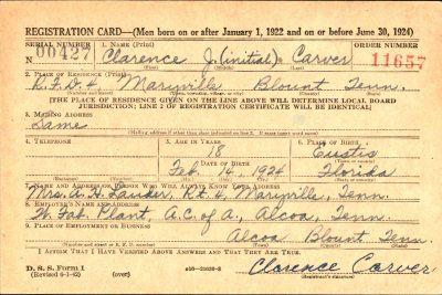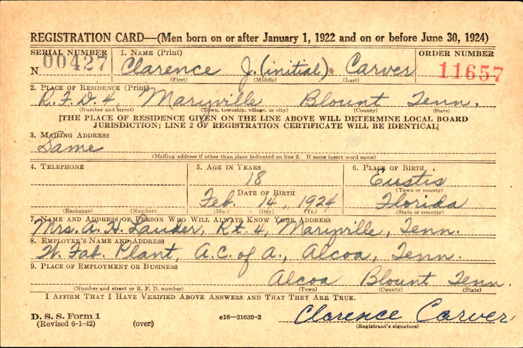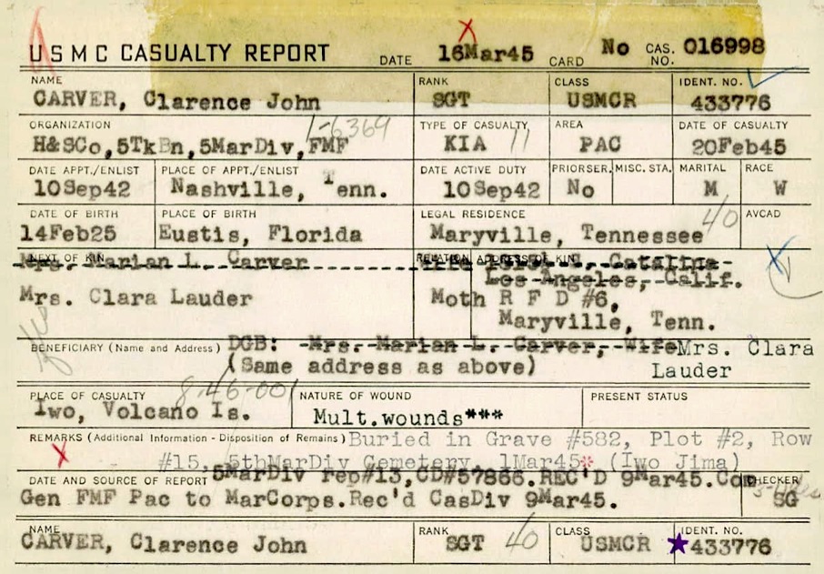 Sergeant Clarence John “Bud” Carver (USMCR) was born in Florida. He was the son of Edgar Harrison Carver and Clara Ica Huffstetler. The family moved to Florida in the 1930s. The parents divorced in 1939 after which Clara moved back to Tennessee. She remarried Allen Howard Lauder in 1939. Clarence Carver and his father stayed in Florida. Sgt Carver was killed on Iwo Jima.