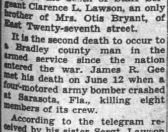Official word was received here today of the death of Staff Sergeant Clarence L. Lawson, an only brother of Mrs. Otis Bryant, of East Twenty-seventh street.