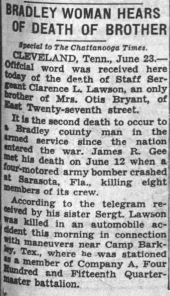 Sgt. Lawson was killed in an accident while on maneuvers at Camp Barkeley in Texas.