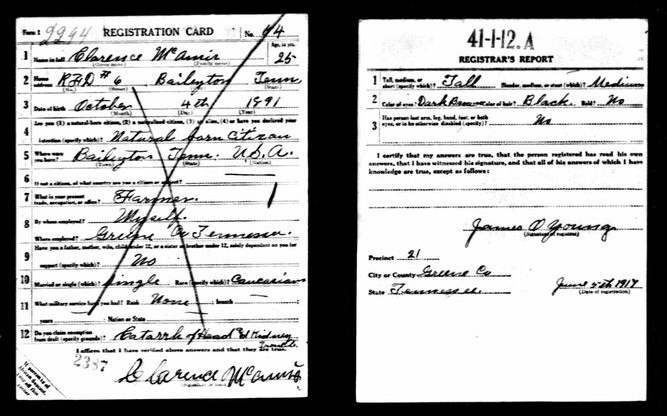Clarence McAmis was born 4 October 1891, Locust Springs in Greene County, Tennessee to Elbert B. and Emma McAmis. He entered the service 9 July 1918 at Greeneville and trained at Fort Thomas in Kentucky and Camp Sheridan, Alabama where he died of broncho-pneumonia following influenza.
