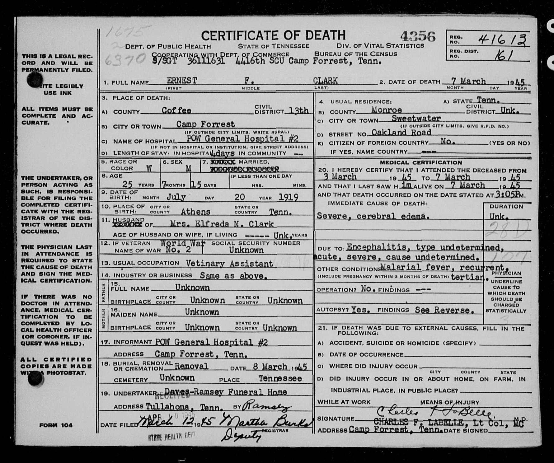 Ernest Franklin Clark was born in Athens, McMinn County, TN. Hometown at the time of his death was Sweetwater, Monroe County, TN. He served during WWII. He was a Veterinary Assistant and died of severe, cerebral edema and bronchial pneumonia on 7 March 1945 in the POW General hospital #2 at Camp Forrest, Tullahoma, TN.
