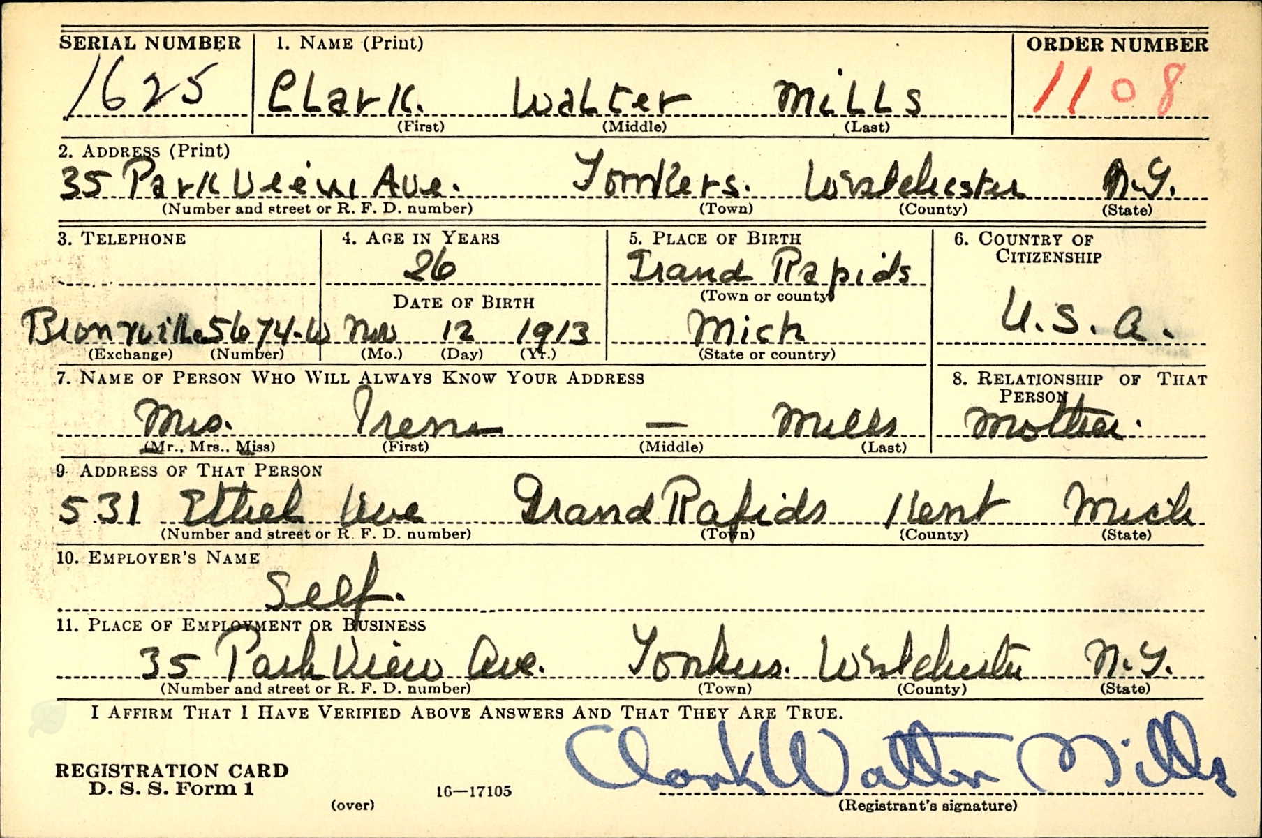 Clark Walter Mills was born at Grand Rapids in Michigan to Clark Wickham Mills and Irene Hedden. He married Elizabeth Williamson in 1938 at New York, Manhattan, New York.