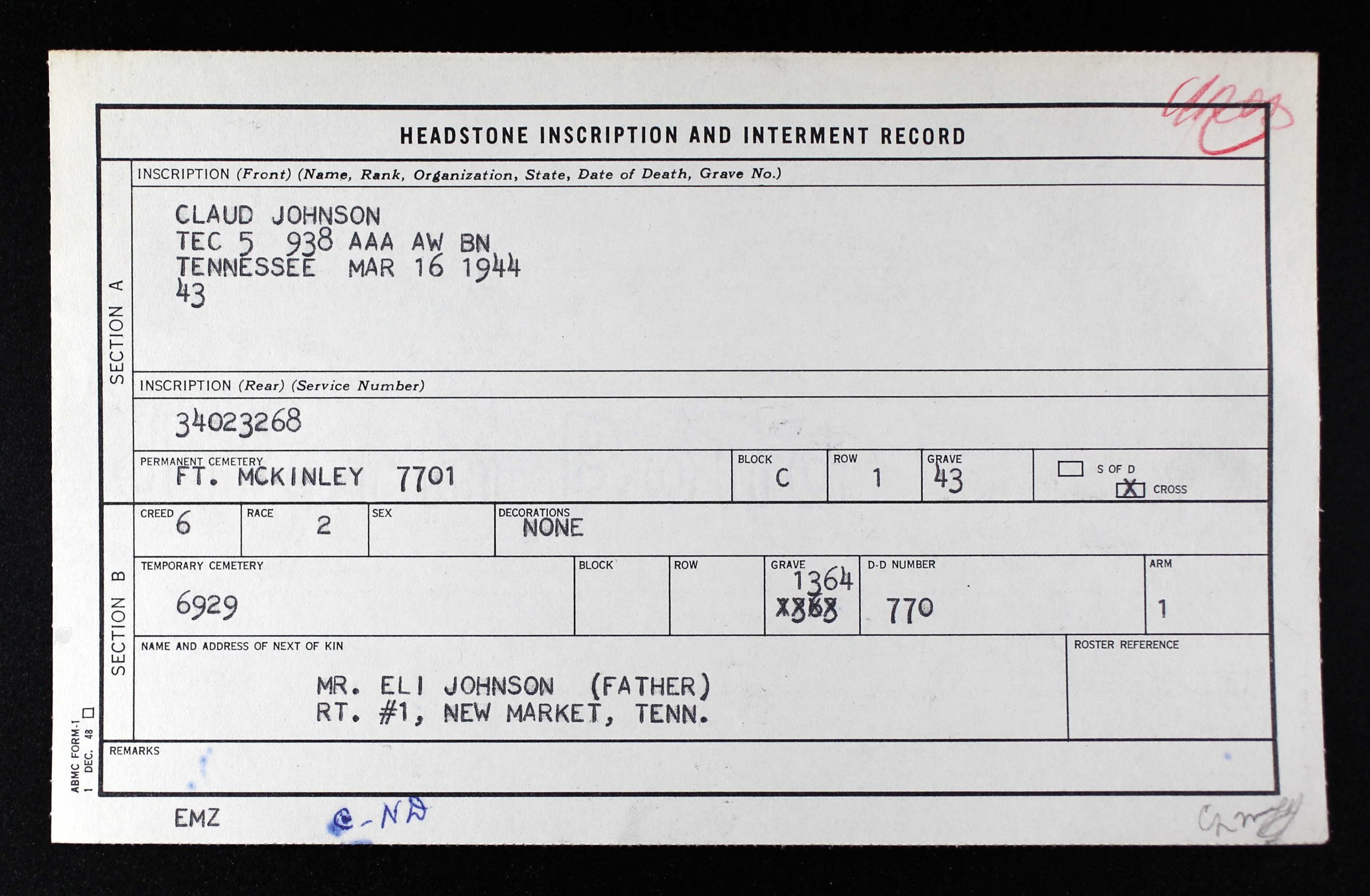 Claud Johnson was initially buried at the USAF Cemetery, Finschaffen #5 in British New Guinea and reburied at Manila American Cemetery, Philippines, C, 1, 43