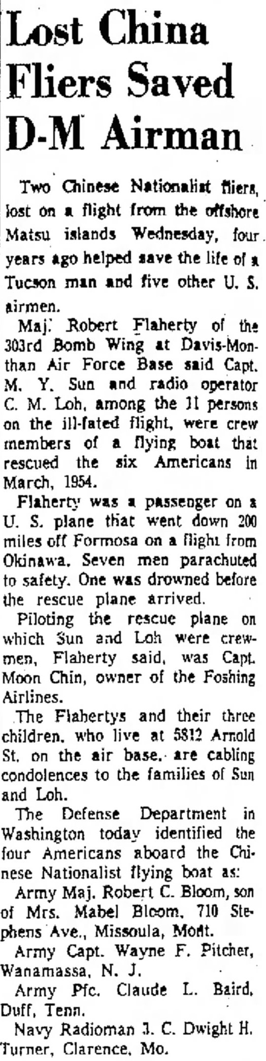 The “Blue Swan” or “Blue Goose,” a PBY-5A seaplane missing as of the same day (Oct. 1, 1958) and en route to Taipei from the island of Matsu, but whose wreckage was just finally found in June 2014, might be the missing plane that Baird was aboard?