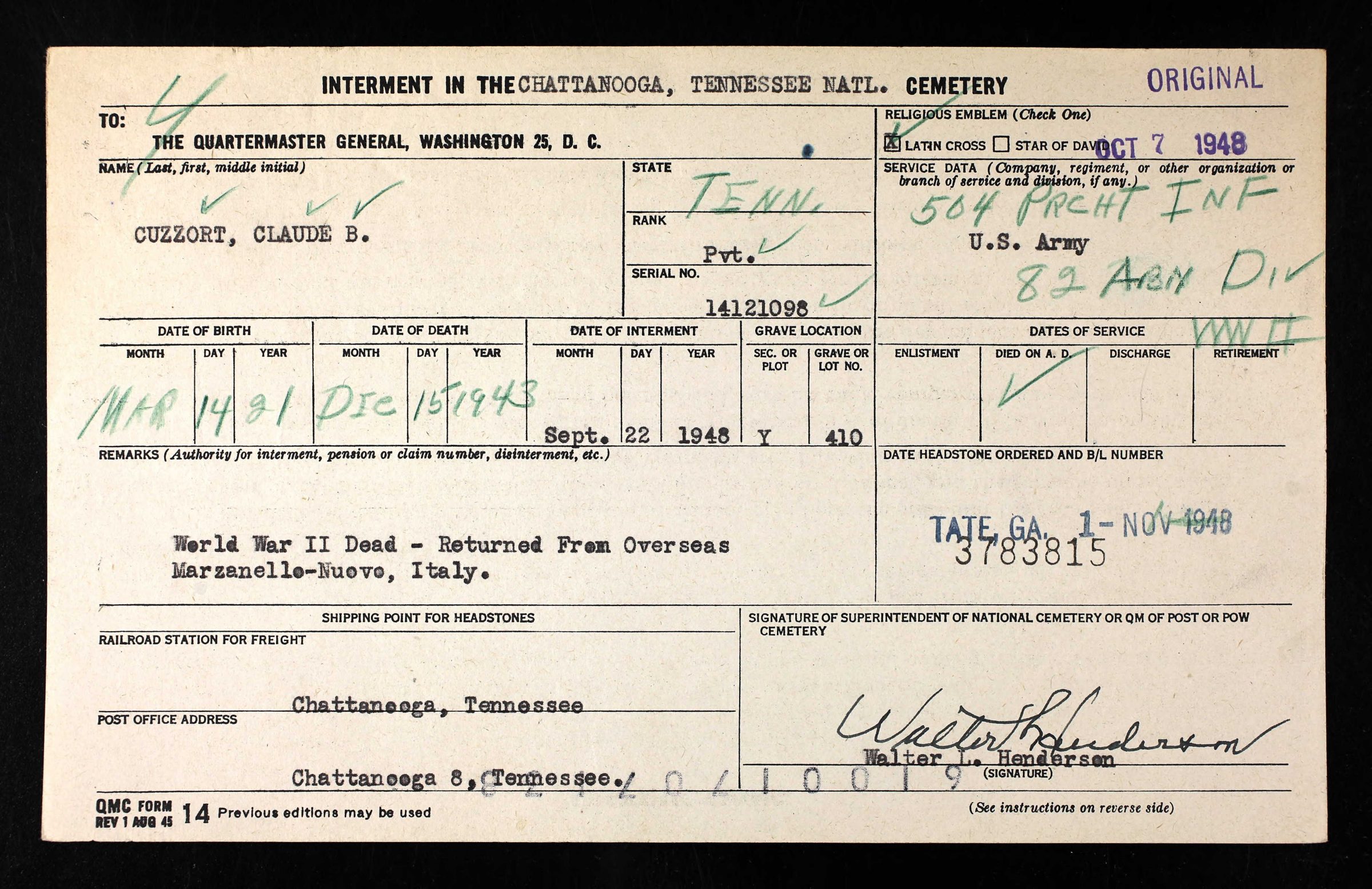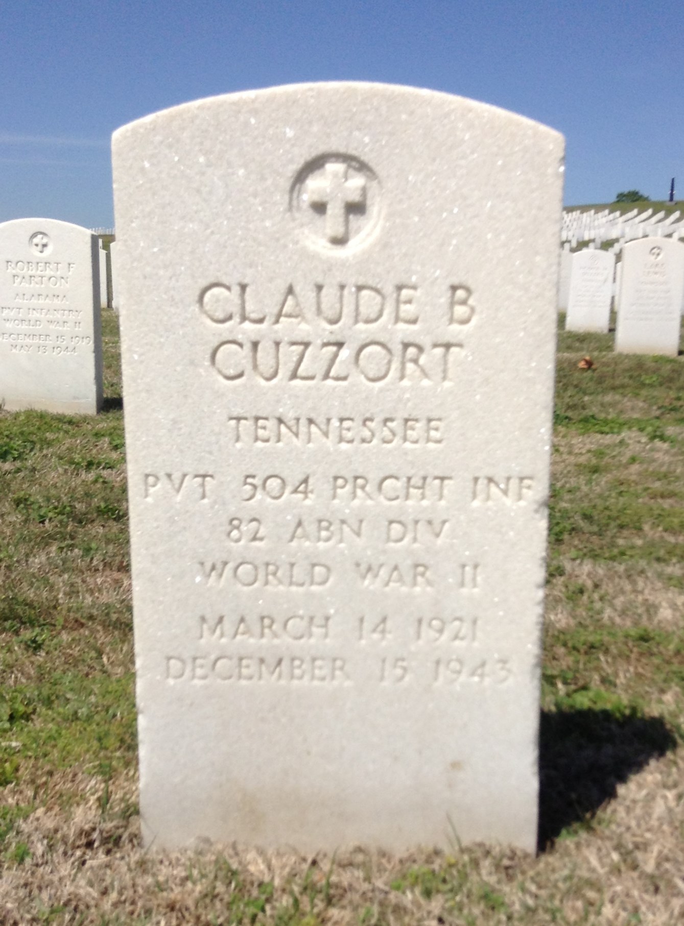 Private Claude B. Cuzzort served in Company E, 504th Parchute Infantry Regiment, 82nd Airborne. He died 15 December 1943 during the Italian Campaign. Pvt Cuzzort was initially buried at Marzanello-Nuovo, Italy. Buried at Chattanooga National Cemetery, Y, 410.
