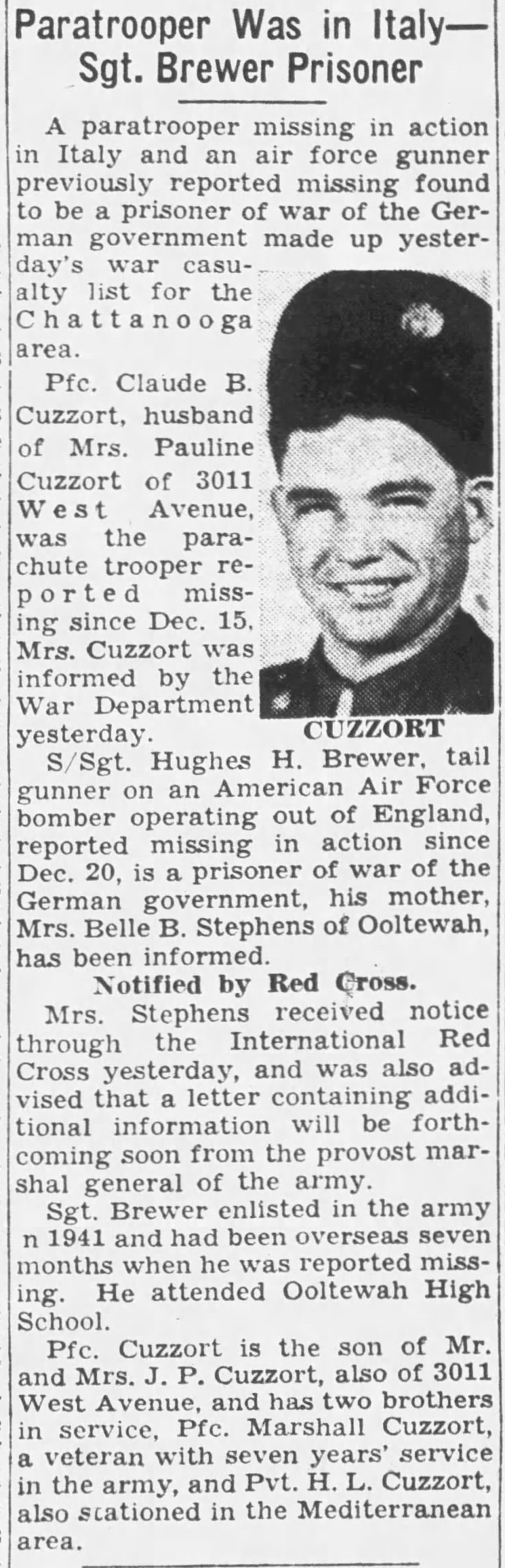 Pfc. Claude B. Cuzzort, husband of Mrs. Pauline Cuzzort of 3011 West Avenue, was the parachute trooper reported missing since Dec. 15. Mrs. Cuzzort was informed by the War Department yesterday. Pfc. Cuzzort is the son of Mr. and Mrs. J.P. Cuzzort, also of 3011 West Avenue, and has two brothers in service, Pfc. Marshall Cuzzort, a veteran with seven years’ service in the army, and Pvt. H.L. Cuzzort, also stationed in the Mediterranean area.
