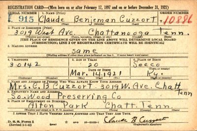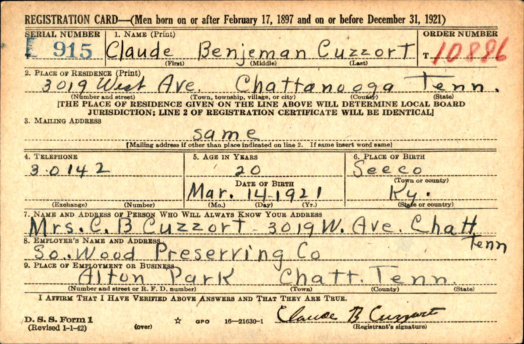 Claude Benjeman Cuzzort was born in Seeco, Kentucky on 14 March 1921 to James Patrick Cuzzort and Virgie Pursley.