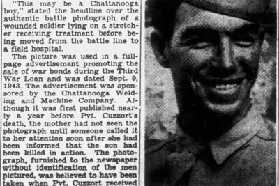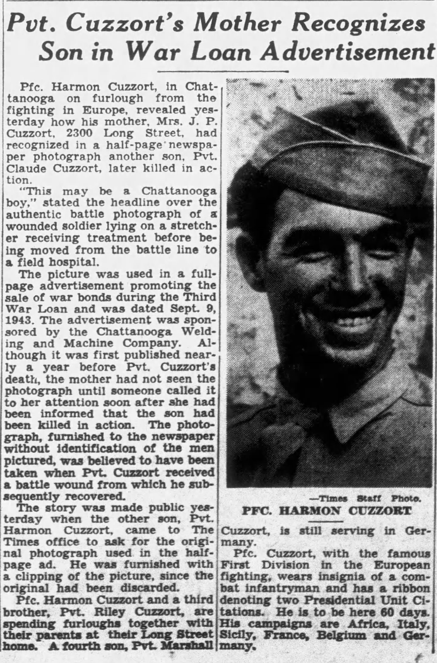 Pfc. Harmon Cuzzort, in Chattanooga on furlough from the fighting in Europe, revealed yesterday how his mother, Mrs. J.P. Cuzzort, 2300 Long Street, had recognized in a half-page newspaper photograph another son, Pvt. Claude Cuzzort, later killed in action. “This may be a Chattanooga boy,” stated the headline over the authentic battle photograph of a wounded soldier lying on a strecher receiving treatment before being moved from the battle line to a field hospital. The picture was used in a full-page advertisement promoting the sale of war bonds during the Third War Loan and was dated Sept. 9, 1943. The advertisement was sponsored by the Chattanooga Welding and Machine Company. Although it was first published nearly a year before Pvt. Cuzzort’s death, the mother had not seen the photograph until someone called it to her attention soon after she had been informed that the son had been killed in action. The photograph, furnished to the newspaper without identification of the men pictured, was believed to have been taken when Pvt. Cuzzort received a battle wound from which he subsequently recovered.