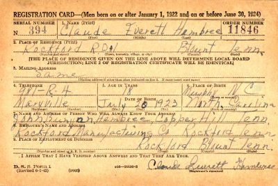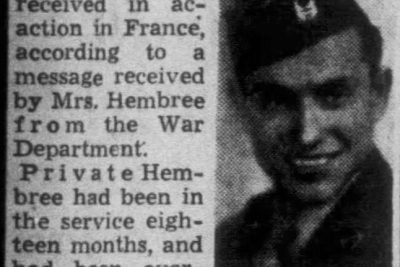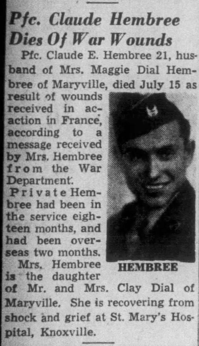 Pfc. Claude E. Hembree, 21, husband of Mrs. Maggie Dial Hembree of Maryville, died July 15 as result of wounds received in action in France, according to a message received by Mrs. Hembree from the War Department. Private Hembree had been in the service eighteen months, and had been overseas two months. Mrs. Hembree is the daughter of Mr. and Mrs. Clay Dial of Maryville. She is recovering from shock and grief at St. Mary’s Hospital, Knoxville.