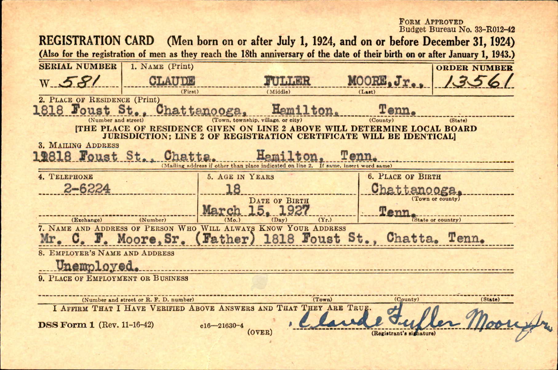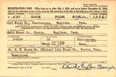 Reported missing in action is Pvt. Claude Fuller Moore jr., 21, son of Mr. and Mrs. Claude F. Moore Sr. of 2917 Rossville Boulevard. His aunt is Mrs. Lorna Mullins of the same address. Youn Moore began his army career at the age of 14, his father said. He served for four years during World War II and was out fora bout 90 days after the war. He has been missing since Aug. 6, the War Department advised his family. He was formerly employed by the Keener Dental Supply Company. The Carter youth enlisted in the army here 18 months ago. He served in the national guard for two years before going into active service. A former student at Central High School, he has been nissing since Sept. 3, his mother said. He landed with his outfit in Korea on Aug. 25, his mother said, and went into the front Lines on the next day.