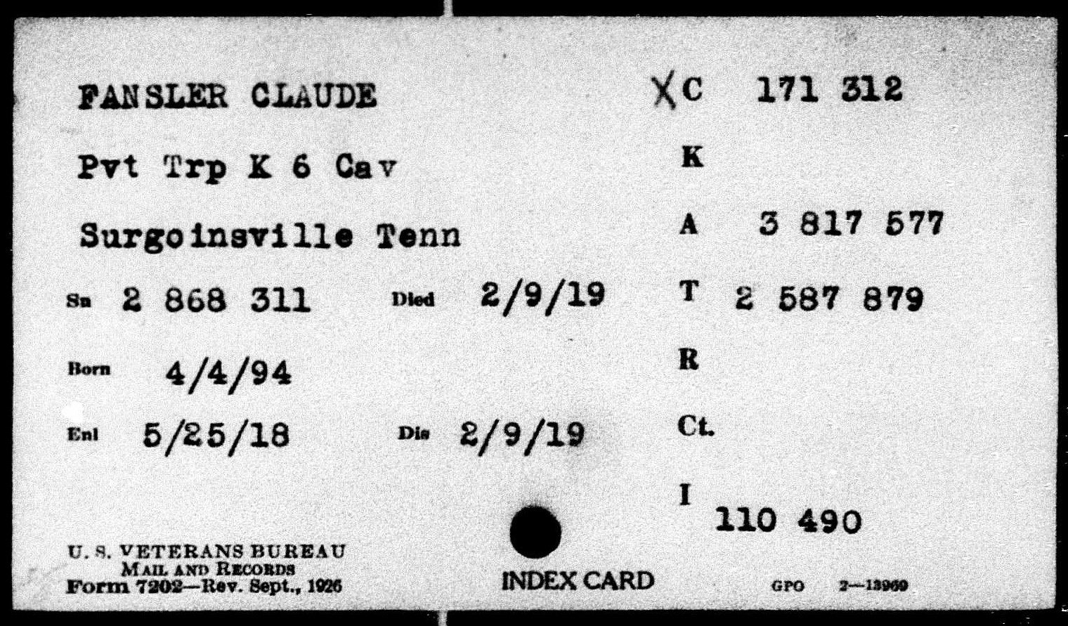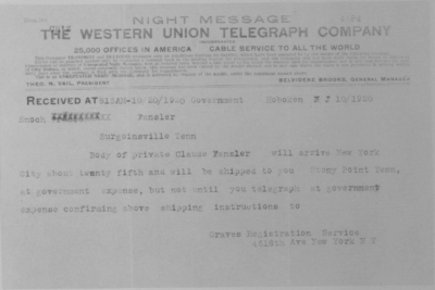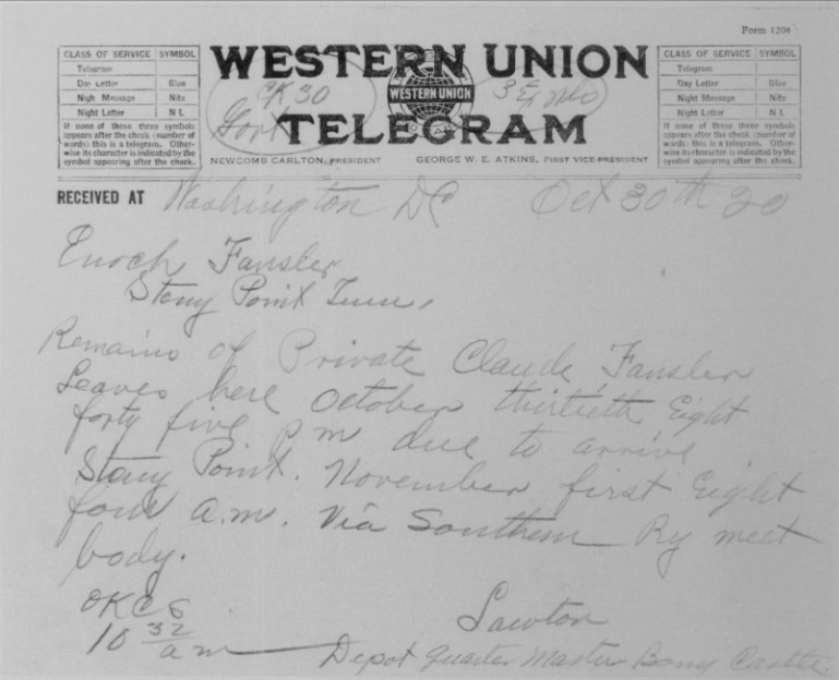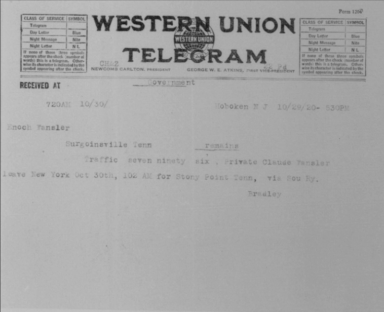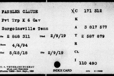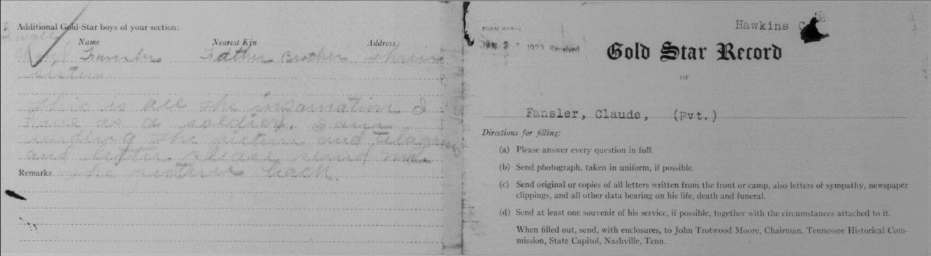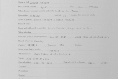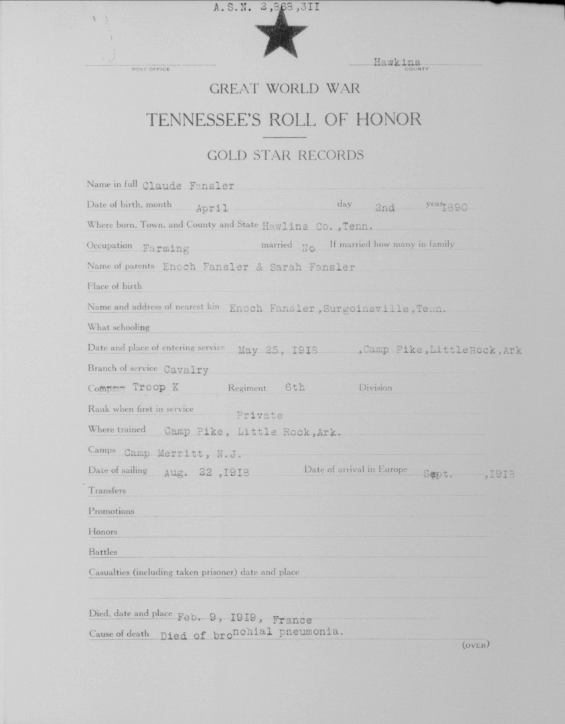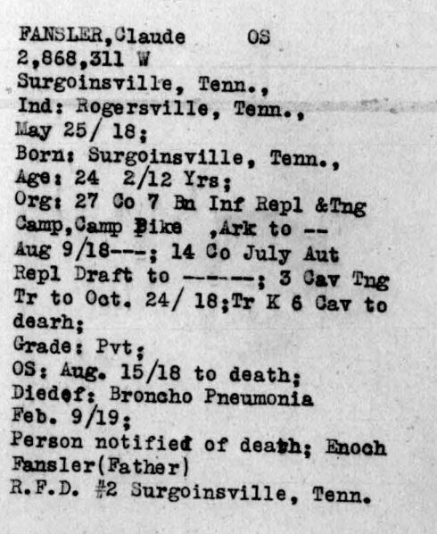 Claude Fansler was born 4 April 1894 in Surgoinsville, Tennessee to Enoch and Sarah Fansler. He entered the service on 25 May 1918 at Camp Pike in Little Rock, Arkansas and received further training at Camp Merritt in New Jersey. He sailed to Europe on 22 August 1918 arriving in September. He died at the age of 24 in France of bronchial pneumonia.