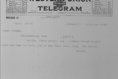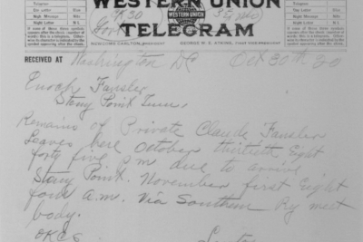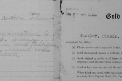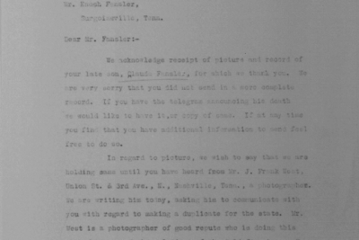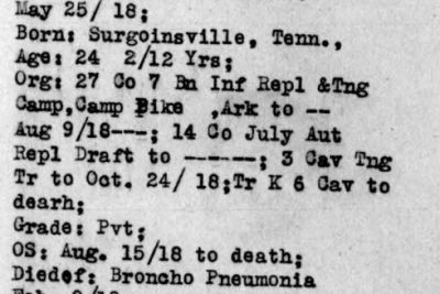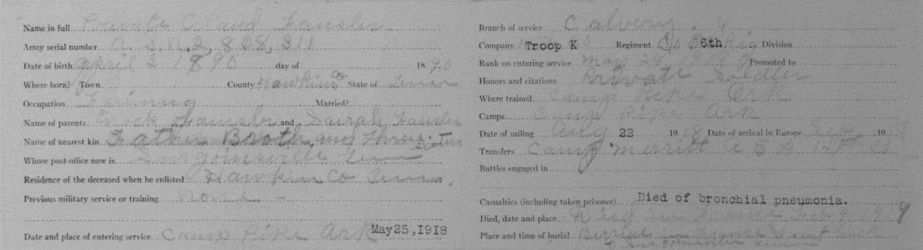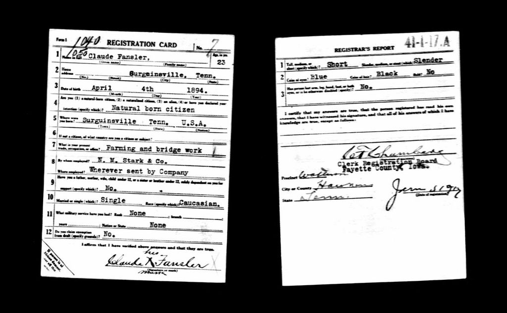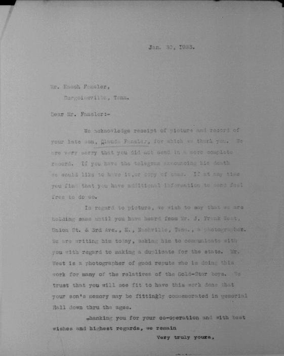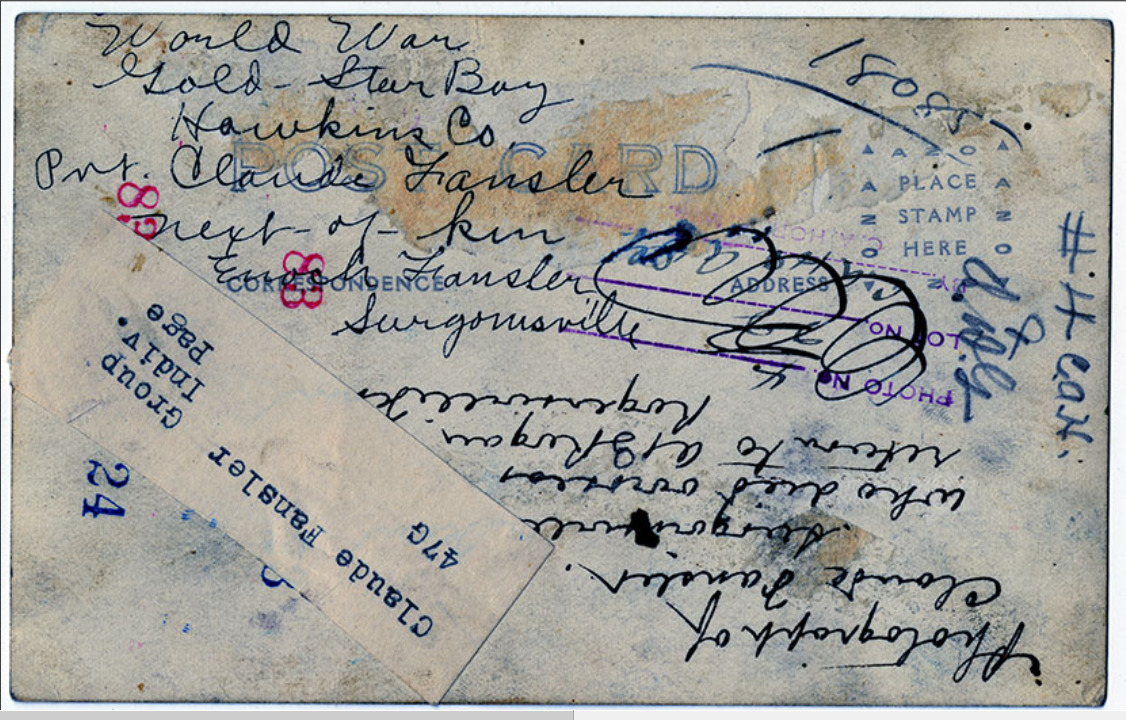 Claude Fansler was born 4 April 1894 in Surgoinsville, Tennessee to Enoch and Sarah Fansler. He entered the service on 25 May 1918 at Camp Pike in Little Rock, Arkansas and received further training at Camp Merritt in New Jersey. He sailed to Europe on 22 August 1918 arriving in September. He died at the age of 24 in France of bronchial pneumonia.