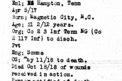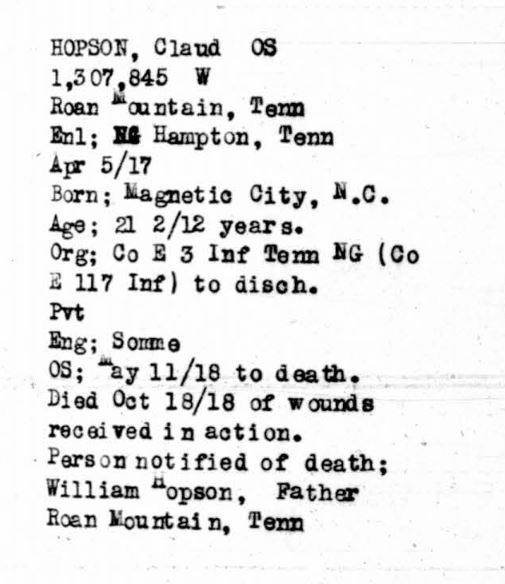 Claude Hopson was born in Magnetic City, North Carolina, March 1895, son of William B. Hopson and Velldora “Bell” Orr. He died of wounds received in action at the age of 23 in Departement de l’Aisne, Picardie, France