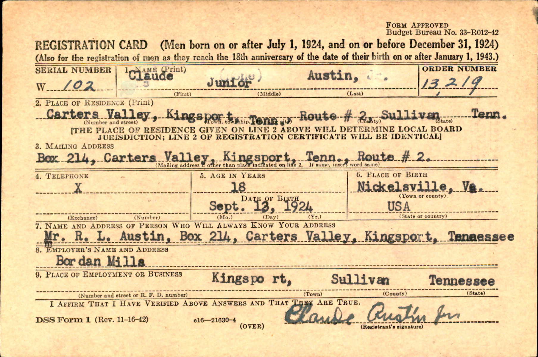 Claude Lee “Junior” Austin was born on 13 October 1924 in Nickelsville, Virginia. He was the son of Robert Lee Austin and Mary Phynetta “Nettie” Pannell.