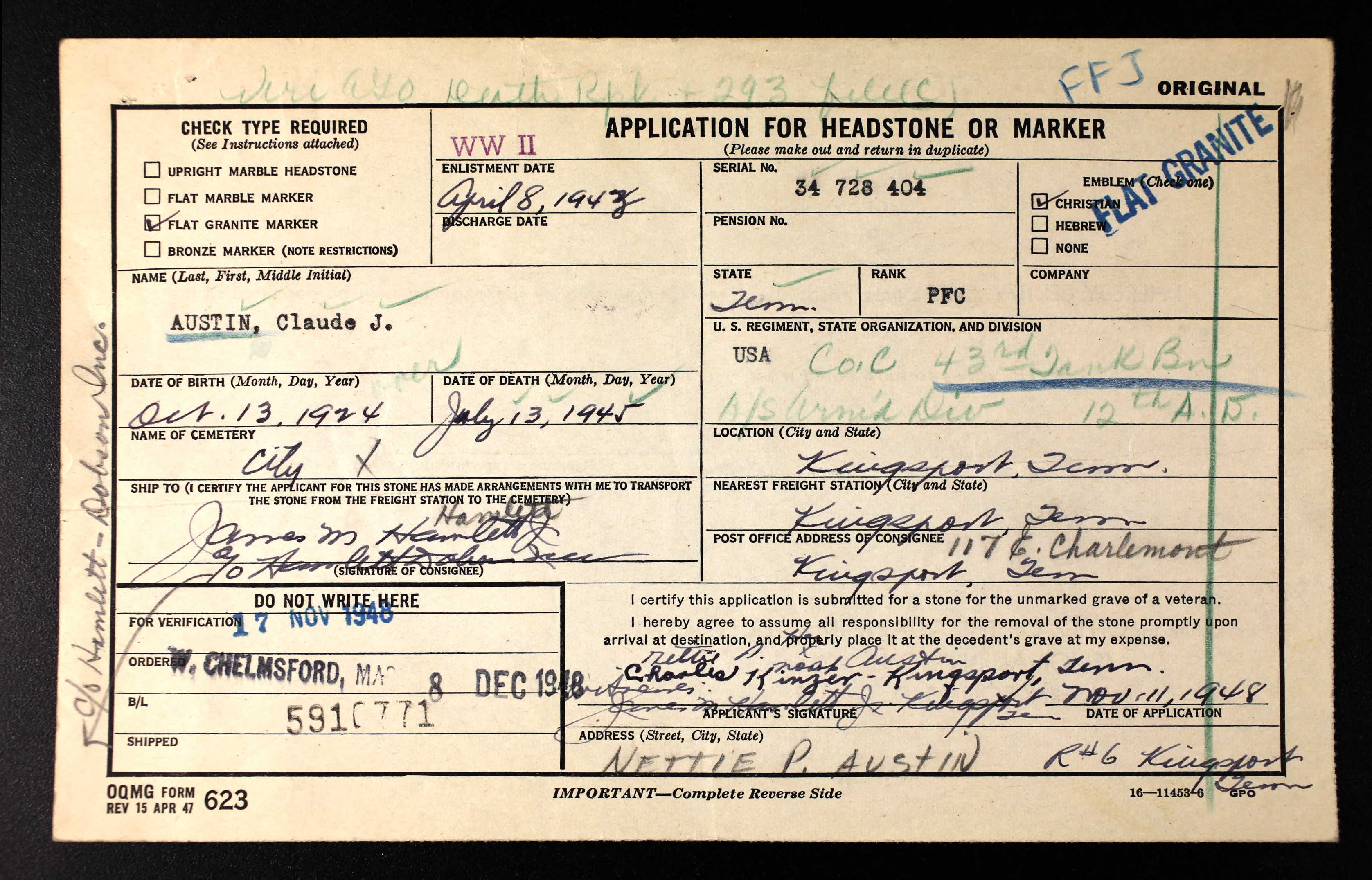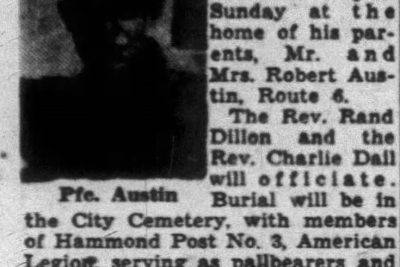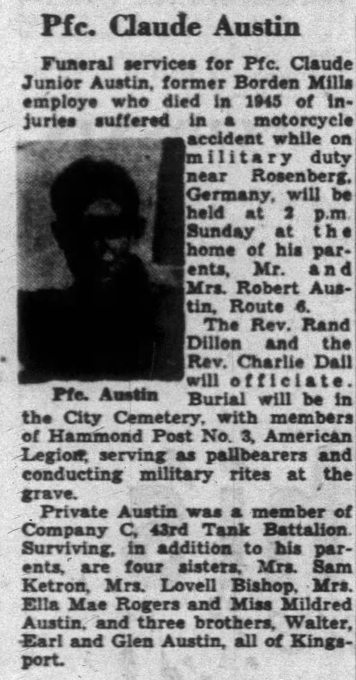 Funeral services for Pfc. Claude Junior Austin, former Borden Mills employe who died in 1945 of injuries suffered in a motorcycle accident while on military duty near Rosenberg, Germany, will be held at the home of his parents, Mr. and Mrs. Robert Austin, Route 6. Burial will be in the City Cemetery, with members of Hammond Post No. 3, American Legion, serving as pallbearers and conducting military rites at the grave. Private Austin was a member of Company C, 43rd Tank Battalion. Surviving, in addition to his parents, are four sisters, Mrs. Sam Ketron, Mrs. Lovell Bishop, Mrs. Ella Mae Rogers and Miss Mildred Austin, and three brothers, Walter, Earl and Glen Austin, all of Kingsport.