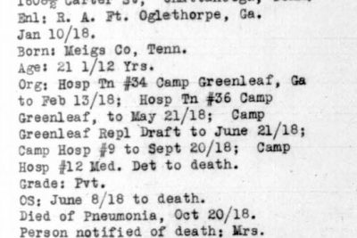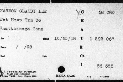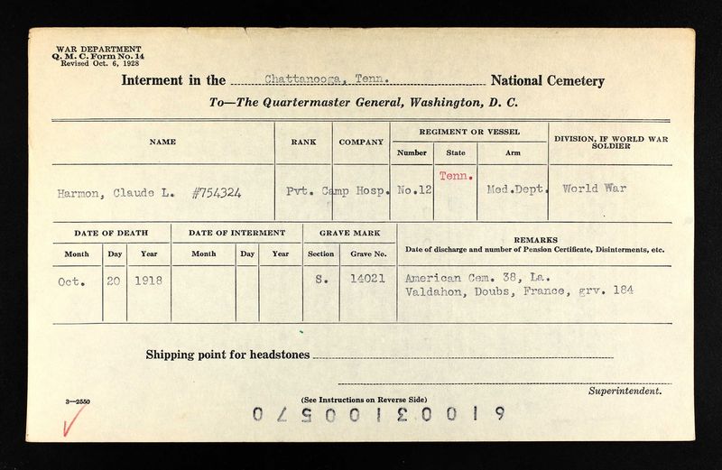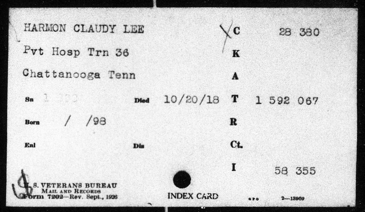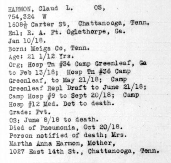 Claude L. Harmon also spelled Claud in State records was born in 1898 in Meigs County, Tennessee. Son of Martha Anna Harmon. He enlisted at Fort Oglethorpe in Georgia on 10 January 1918. Pvt Harmon died of pneumonia on 20 October 1918 at the age of 21. He was first buried at the American Cemetery 38, Valdahon, Doubs, France, Grave 184. He is now buried at the Chattanooga National Cemetery, Site S, Grave 14021