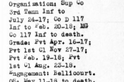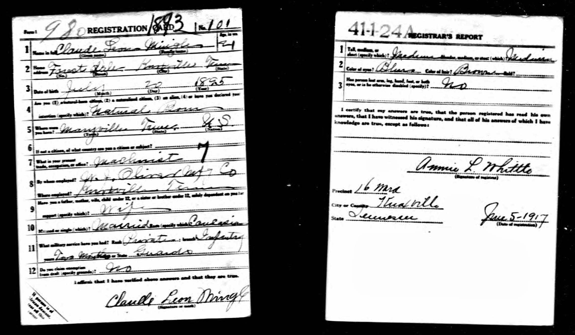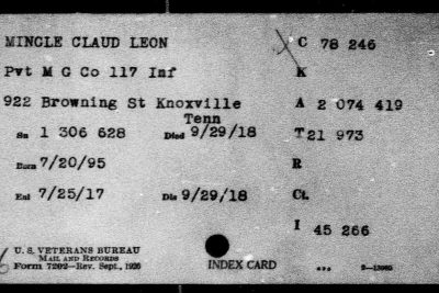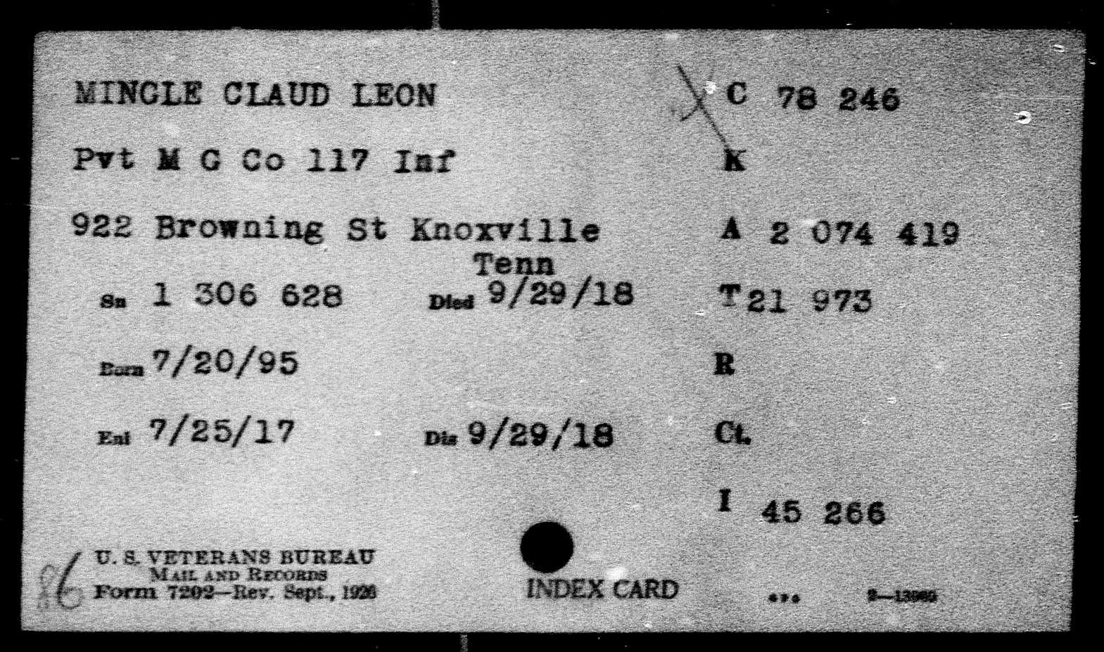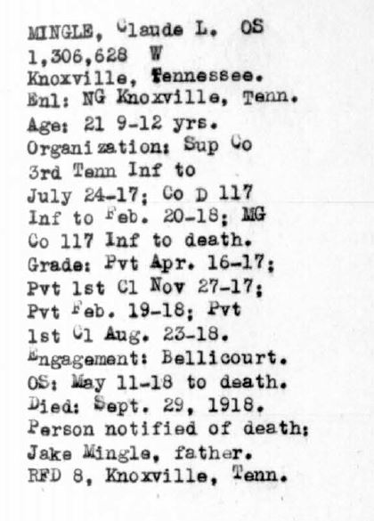 Private Claude Leon Mingle was born July 20, 1895, in Maryville, TN. Prior to the war, he was married and was working as a machinist in Knoxville. Private Mingle was a member of the 117th regiment, under Col Cary F. Spence. He was a son of Mr. and Mrs. J.A. Mingle, residing on the Middlebrook pike. Private Mingle married Miss Ruby Vineyard, daughter of Mr. and Mrs. W.A. Vineyard, of Forestdale. The papers and other things taken from his pockets by a comrade were sent to his relatives. Private Mingle was an employee of the Wm. J. Oliver plant before he enlisted for service in the army.