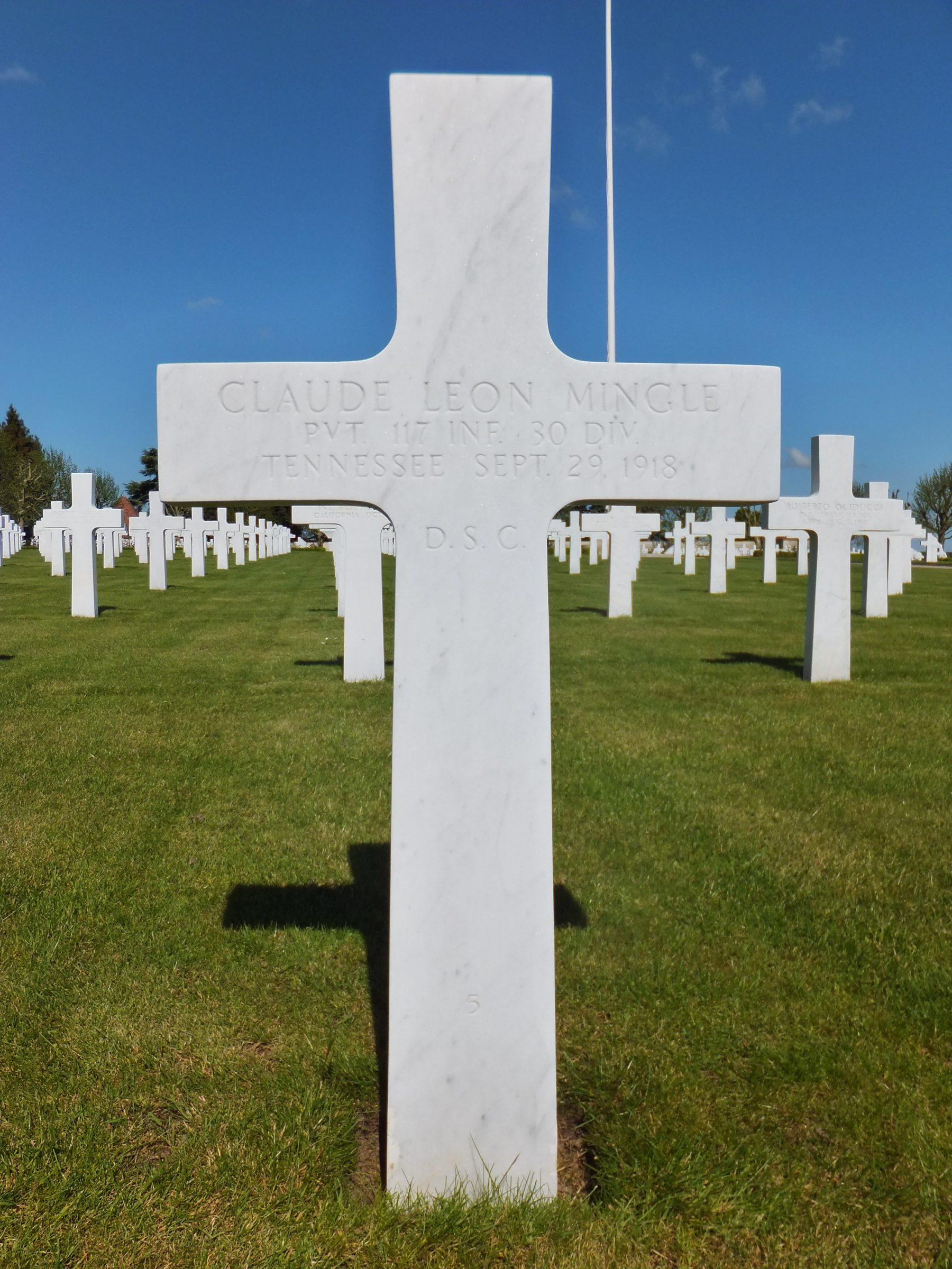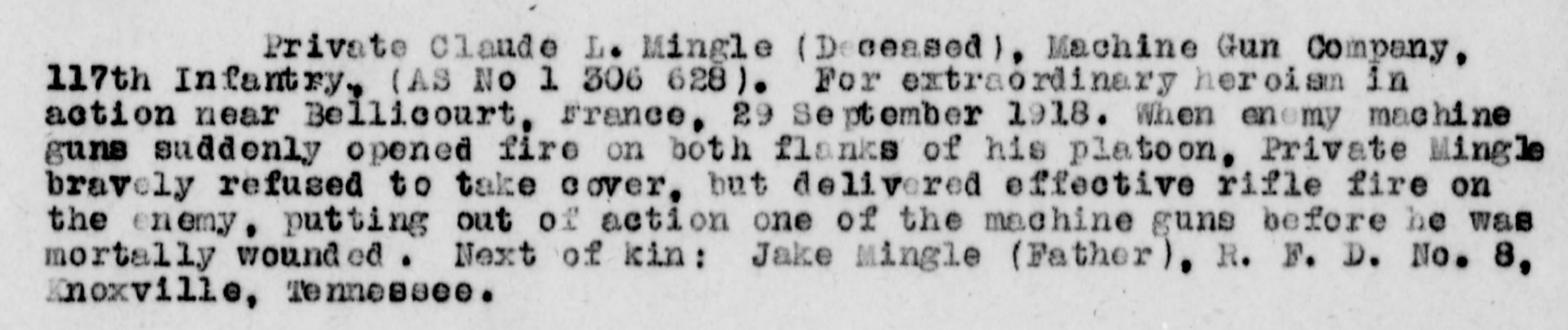 The President of the United States of America, authorized by Act of Congress, July 9, 1918, takes pride in presenting the Distinguished Service Cross Posthumously to Private Claude L. Mingle ASN 1306628, United States Army, for extraordinary heroism in action while serving with Machine-Gun Company, 117th Infantry Regiment, 30th Division, A.E.F., near Bellicourt, France, 29 September 1918. When enemy machine guns suddenly opened fire on both flanks of his platoon, Private Mingle bravely refused to take cover, but delivered effective rifle fire on the enemy, putting out of action one of the machine guns before he was mortally wounded. War Department, General Orders No. 37 1919