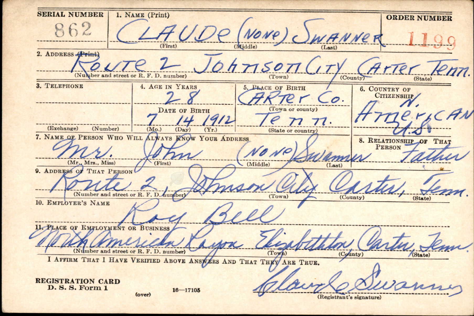 Claude Swanner was born at Milligan, Tennessee, the son of John William Swanner and Mary Hester Woody Swanner. He married Bertha Bennett in 1940 and was the father of Clarence Swanner who died at the age of 4.