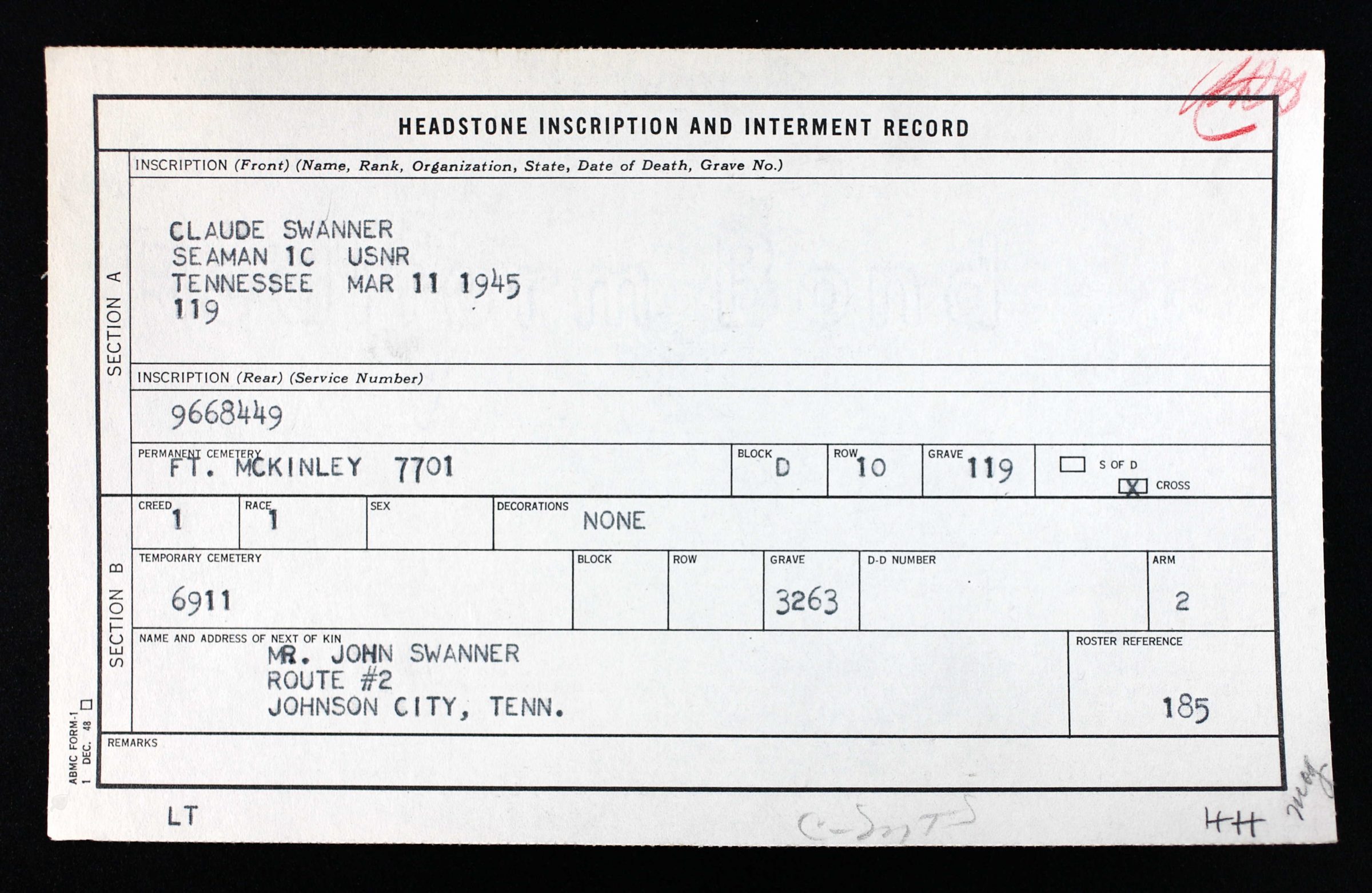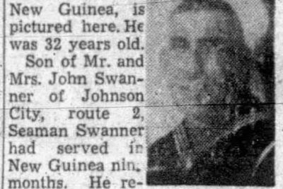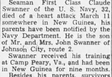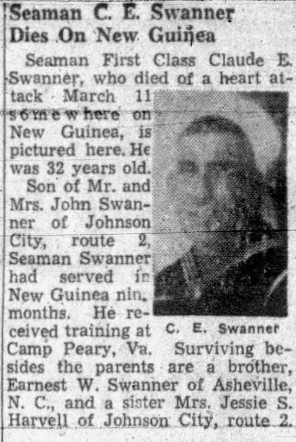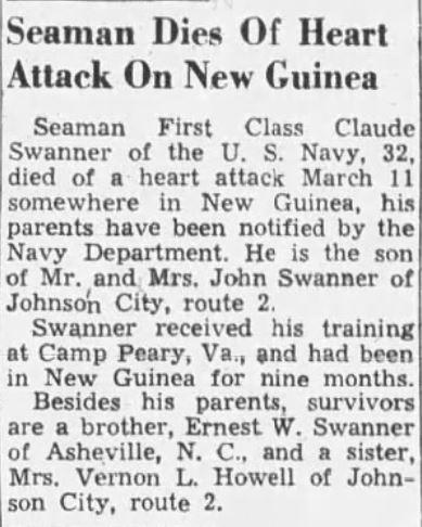 Seaman First Class Claude Swanner, of the U.S. Navy, 32, died of a heart attack March 11 somewhere in New Guinea, his parents have been notified by the Navy Department. He is the son of Mr. and Mrs. John Swanner of Johnson City, route 2. Swanner received his training at Camp Peary, Va., and had been in New Guinea for nine months. Besides his parents, survivors are a brother, Ernest W. Swanner, of Asheville, N.C. and a sister, Mrs. Vernon L. Howell of Johnson City, route 2.
