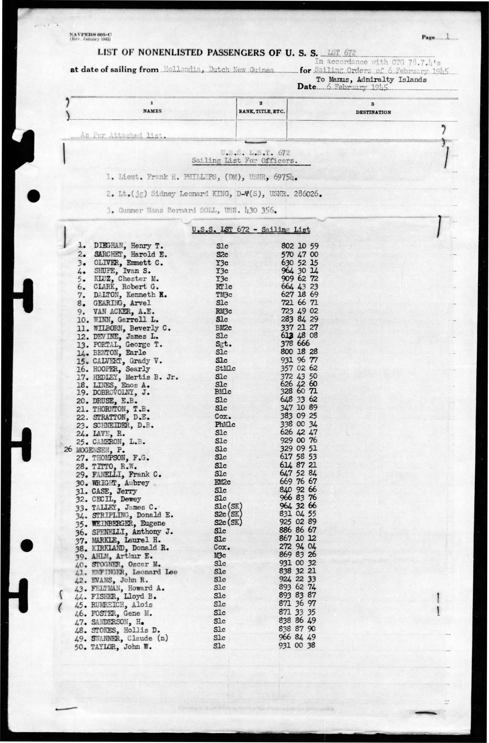 Claude Swanner was a passenger on the U.S.S. LST 672, sailing from Hollandia, Dutch New Guinea to Manus, Admiralty Islands on 6 February 1945.