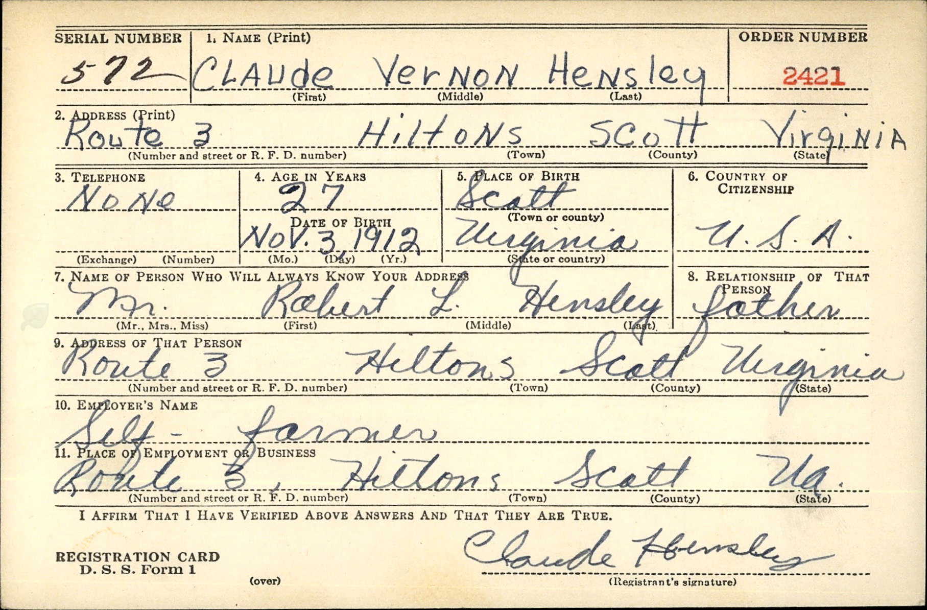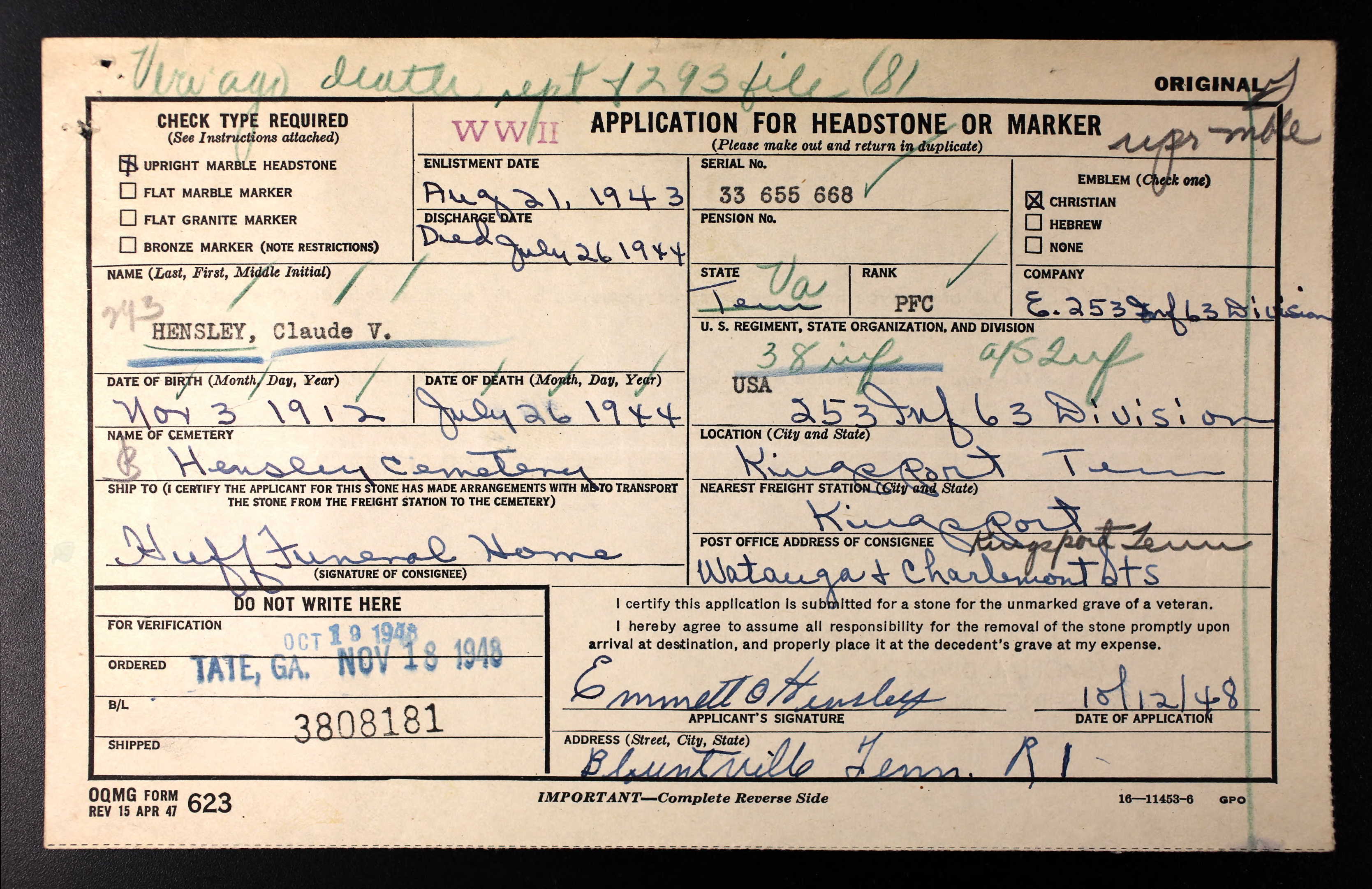 Claude Vernon Hensley was born on 3 November 1912 in Scott, Virginia. He was the son of Robert Lee Hensley and Ellen Anna Willis.He received basic training at Camp Van Dorn in Mississippi. Prior to induction in the army, he had been making his home with Charles C. Barr. He went overseas in June of 1944.