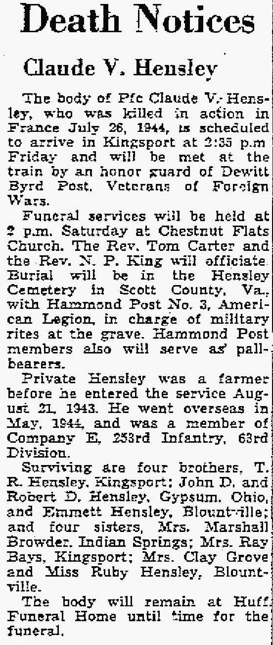 The body of PFC Claude V. Hensley, who was killed in action in France, July 26, 1944 is scheduled to arrive in Kingsport at 2:35 p.m. Friday and will be met at the train by an honor guard of Dewitt Byrd Post, Veterans of Foreign Wars.