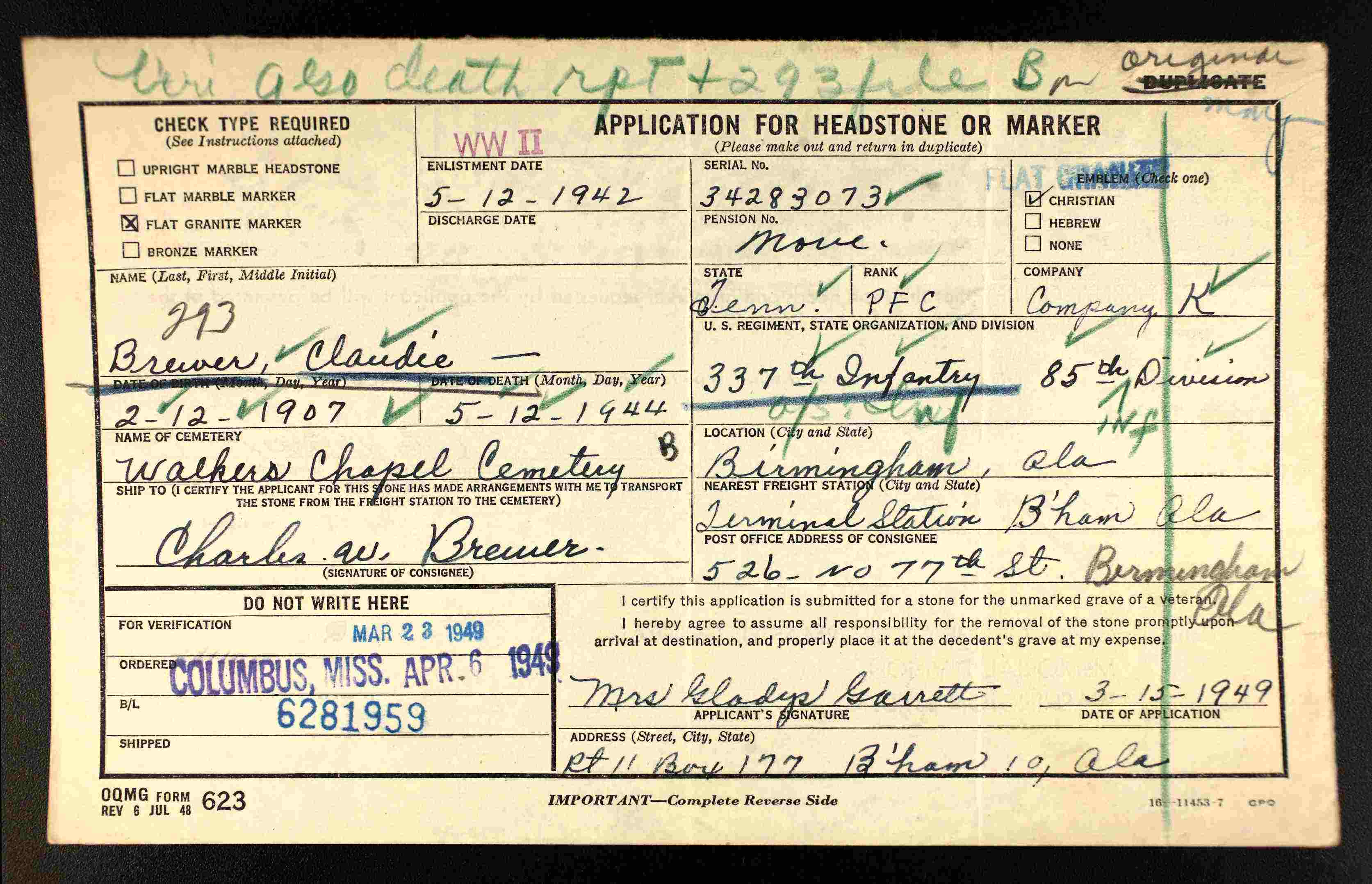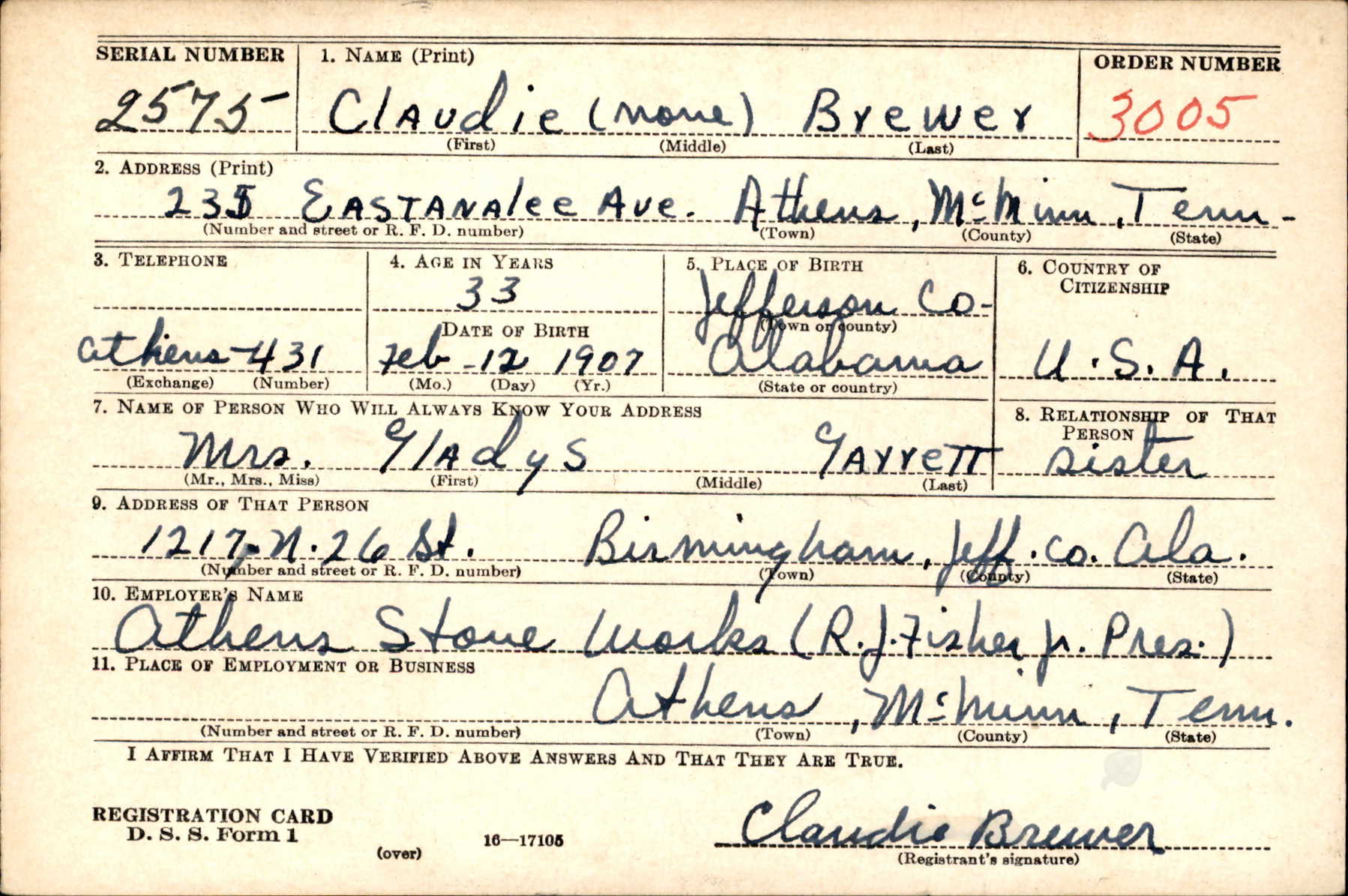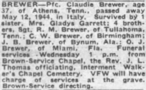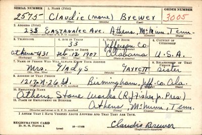 Claudie Brewer was born on 12 February 1907 in Alabama to William Daniel Brewer and Nancy Ann Walker. Husband of Lucille Brewer.