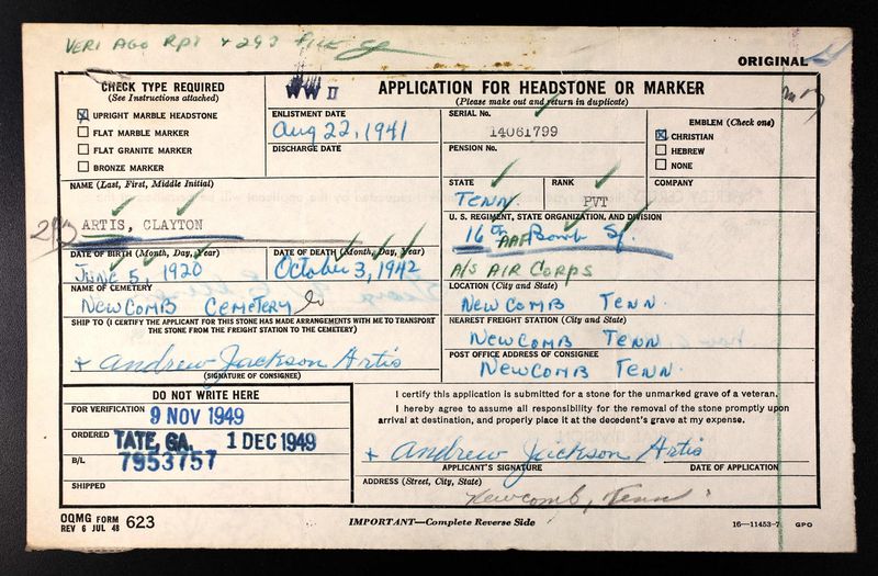Clayton Artis was born on 5 June 1920, the son of Andrew Jackson Artis and Carrie Nunnally.