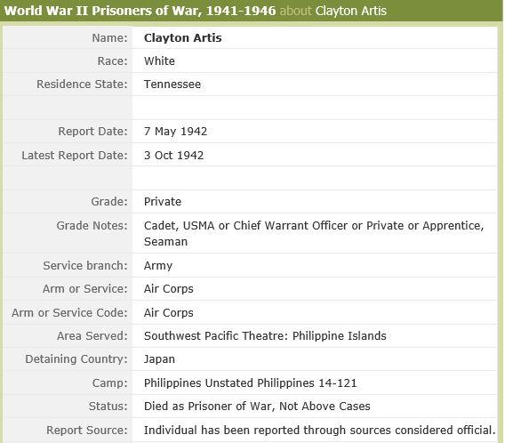 Clayton Artis, Serial Number 14061799, was captured by the Japanese on 7 May 1942 and died as Prisoner of War on 3 October 1942, Old Bilibid Prison, Rizal, Manila, Philippines
