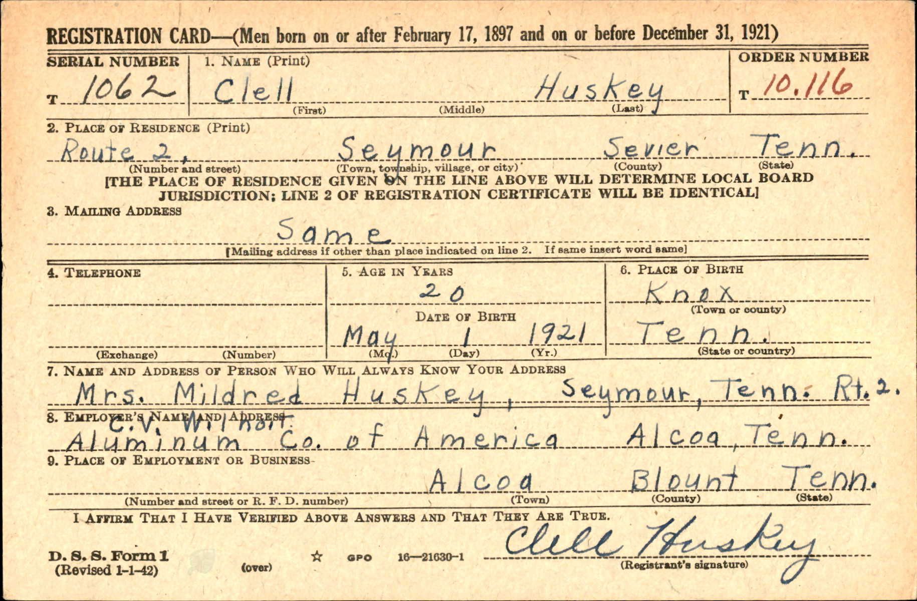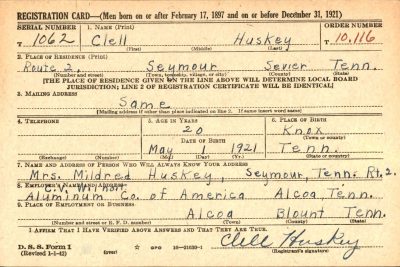 Clell Huskey was the son of Eldridge L. Huskey and Louise Trentham. Husband of Mildred Louise Depew. He enlisted at Fort Oglethorpe in Georgia on August 8, 1942.