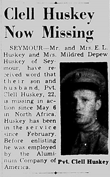 Seymour – Mr. and Mrs. E.L. Huskey and Mrs. Mildred Depew Huskey of Seymour, have received word that their son and husband, Pvt. Clell Huskey, 22, is missing in action since May 6 in North Africa. Huskey had been in the service since February. Before enlisting he was employed by the Aluminum Company of America.